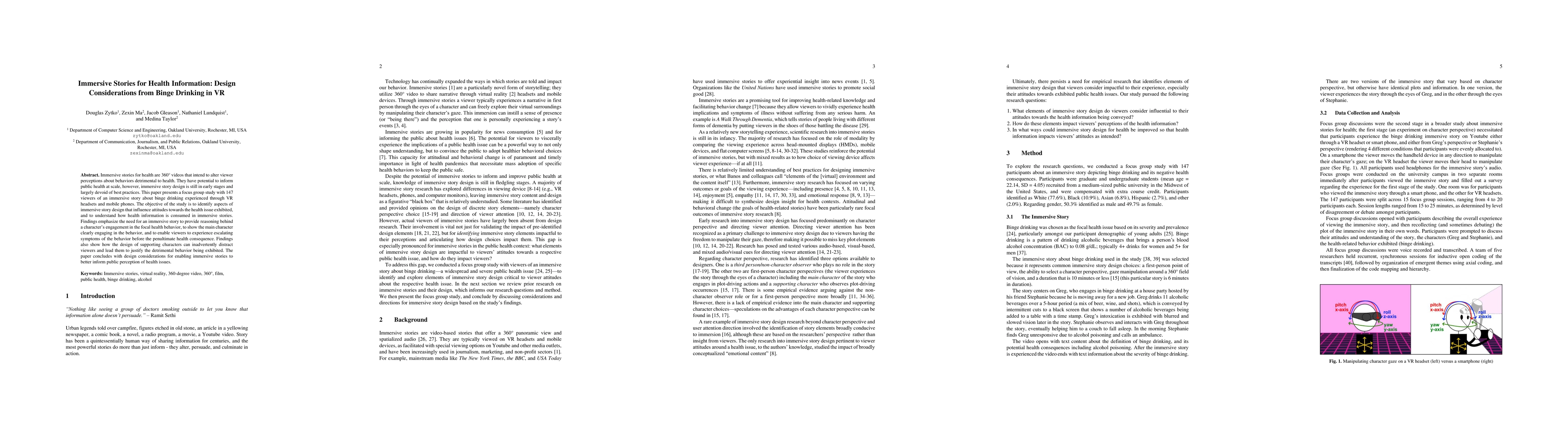Immersive stories for health are 360-degree videos that intend to alter viewer perceptions about behaviors detrimental to health. They have potential to inform public health at scale, however, immersive story design is still in early stages and largely devoid of best practices. This paper presents a focus group study with 147 viewers of an immersive story about binge drinking experienced through VR headsets and mobile phones. The objective of the study is to identify aspects of immersive story design that influence attitudes towards the health issue exhibited, and to understand how health information is consumed in immersive stories. Findings emphasize the need for an immersive story to provide reasoning behind character engagement in the focal health behavior, to show the main character clearly engaging in the behavior, and to enable viewers to experience escalating symptoms of the behavior before the penultimate health consequence. Findings also show how the design of supporting characters can inadvertently distract viewers and lead them to justify the detrimental behavior being exhibited. The paper concludes with design considerations for enabling immersive stories to better inform public perception of health issues.
