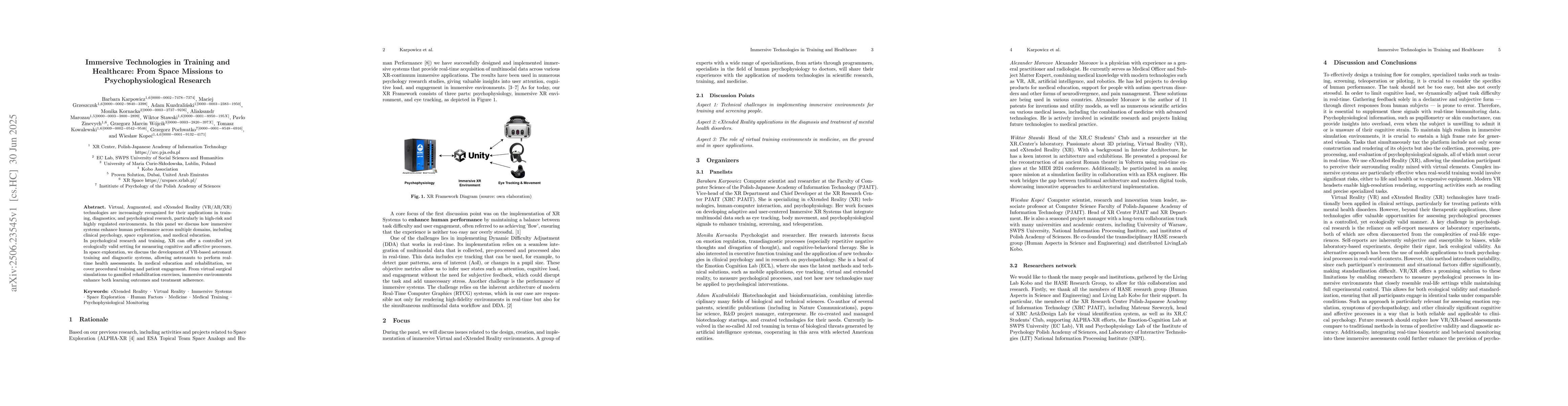 Virtual, Augmented, and eXtended Reality (VR/AR/XR) technologies are increasingly recognized for their applications in training, diagnostics, and psychological research, particularly in high-risk and highly regulated environments. In this panel we discuss how immersive systems enhance human performance across multiple domains, including clinical psychology, space exploration, and medical education. In psychological research and training, XR can offer a controlled yet ecologically valid setting for measuring cognitive and affective processes. In space exploration, we discuss the development of VR-based astronaut training and diagnostic systems, allowing astronauts to perform real-time health assessments. In medical education and rehabilitation, we cover procedural training and patient engagement. From virtual surgical simulations to gamified rehabilitation exercises, immersive environments enhance both learning outcomes and treatment adherence.