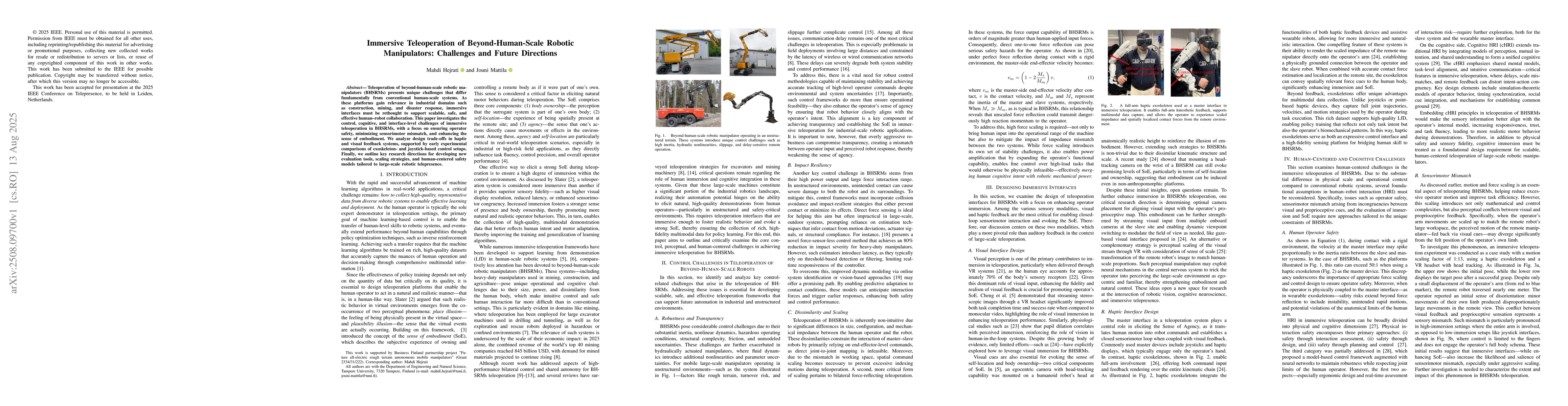 Teleoperation of beyond-human-scale robotic manipulators (BHSRMs) presents unique challenges that differ fundamentally from conventional human-scale systems. As these platforms gain relevance in industrial domains such as construction, mining, and disaster response, immersive interfaces must be rethought to support scalable, safe, and effective human-robot collaboration. This paper investigates the control, cognitive, and interface-level challenges of immersive teleoperation in BHSRMs, with a focus on ensuring operator safety, minimizing sensorimotor mismatch, and enhancing the sense of embodiment. We analyze design trade-offs in haptic and visual feedback systems, supported by early experimental comparisons of exoskeleton- and joystick-based control setups. Finally, we outline key research directions for developing new evaluation tools, scaling strategies, and human-centered safety models tailored to large-scale robotic telepresence.