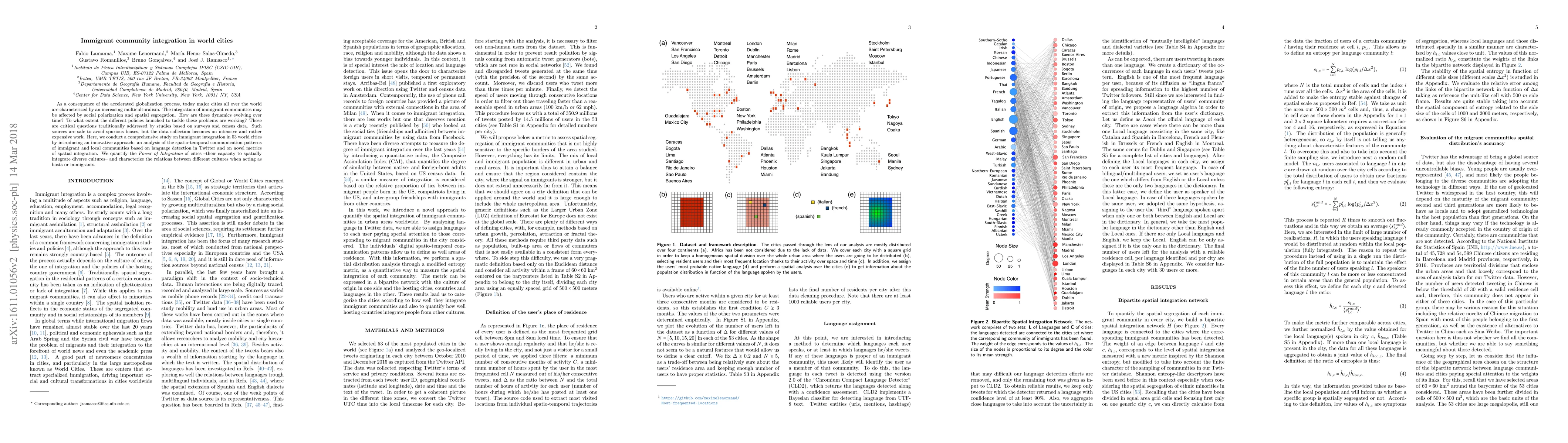 This study explores the integration of immigrant communities in 53 world cities using Twitter data to analyze spatio-temporal communication patterns and spatial integration metrics. It aims to quantify the "Power of Integration" of cities and assess the effectiveness of policies addressing social polarization and spatial segregation.