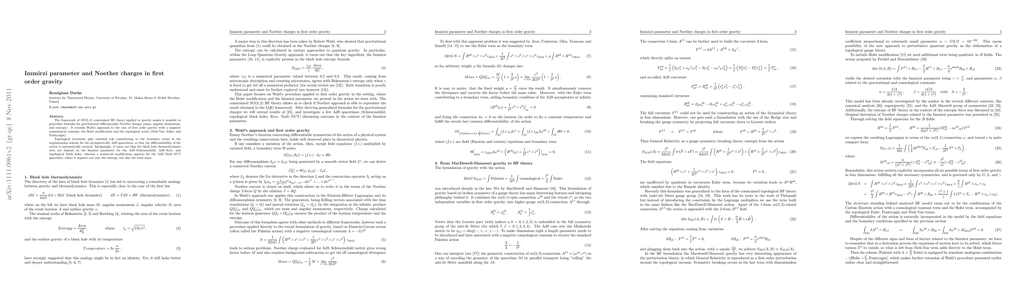 The framework of SO(3,2) constrained BF theory applied to gravity makes it possible to generalize formulas for gravitational diffeomorphic Noether charges (mass, angular momentum, and entropy). It extends Wald's approach to the case of first order gravity with a negative cosmological constant, the Holst modification and the topological terms (Nieh-Yan, Euler, and Pontryagin). Topological invariants play essential role contributing to the boundary terms in the regularization scheme for the asymptotically AdS spacetimes, so that the differentiability of the action is automatically secured. Intriguingly, it turns out that the black hole thermodynamics does not depend on the Immirzi parameter for the AdS-Schwarzschild, AdS-Kerr, and topological black holes, whereas a nontrivial modification appears for the AdS-Taub-NUT spacetime, where it impacts not only the entropy, but also the total mass.