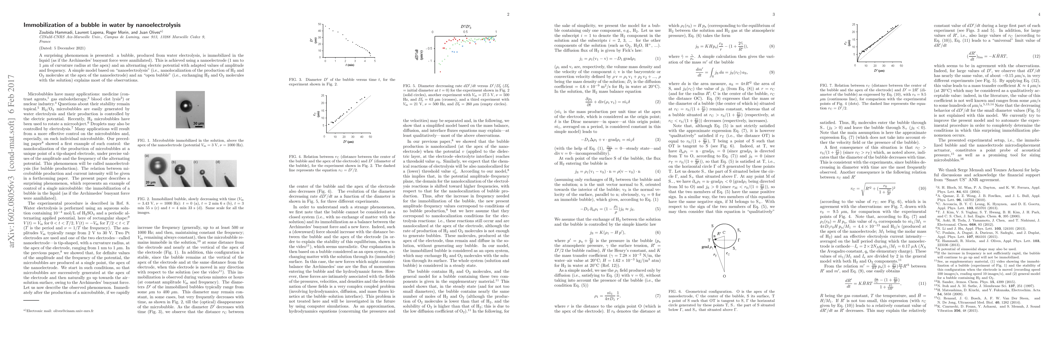 A surprising phenomenon is presented: a bubble, produced from water electrolysis, is immobilized in the liquid (as if the Archimedes' buoyant force were annihilated). This is achieved using a nanoelectrode (1 nm to 1 $\mu$m of curvature radius at the apex) and an alternating electric potential with adapted values of amplitude and frequency. A simple model based on "nanoelectrolysis" (i.e., nanolocalization of the production of H2 and O2 molecules at the apex of the nanoelectrode) and an "open bubble" (i.e., exchanging H2 and O2 molecules with the solution) explains most of the observations.
