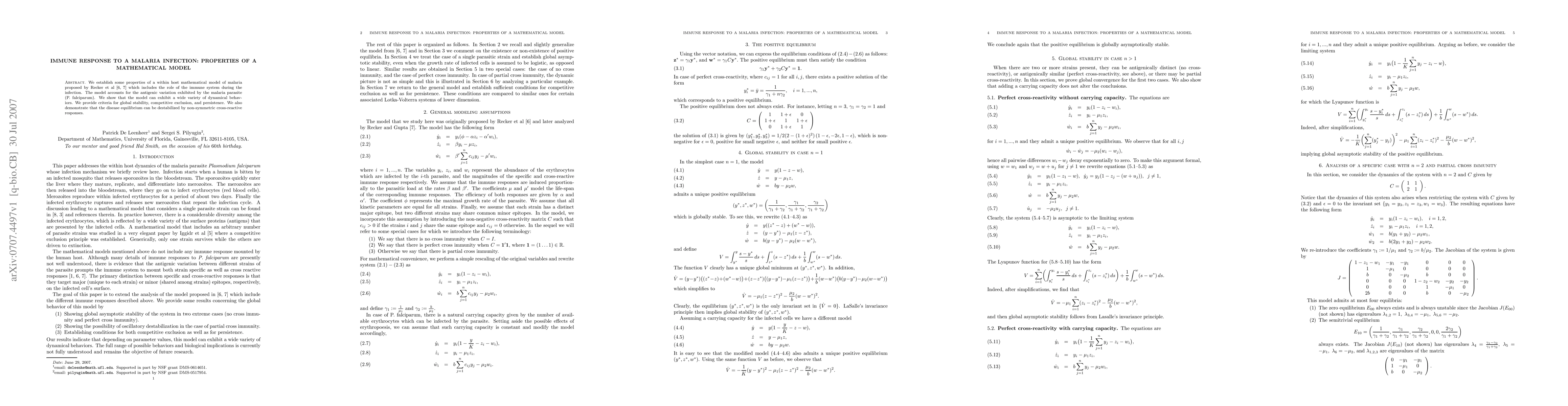 We establish some properties of a within host mathematical model of malaria proposed by Recker et al which includes the role of the immune system during the infection. The model accounts for the antigenic variation exhibited by the malaria parasite (P. falciparum). We show that the model can exhibit a wide variety of dynamical behaviors. We provide criteria for global stability, competitive exclusion, and persistence. We also demonstrate that the disease equilibrium can be destabilized by non-symmetric cross-reactive responses.