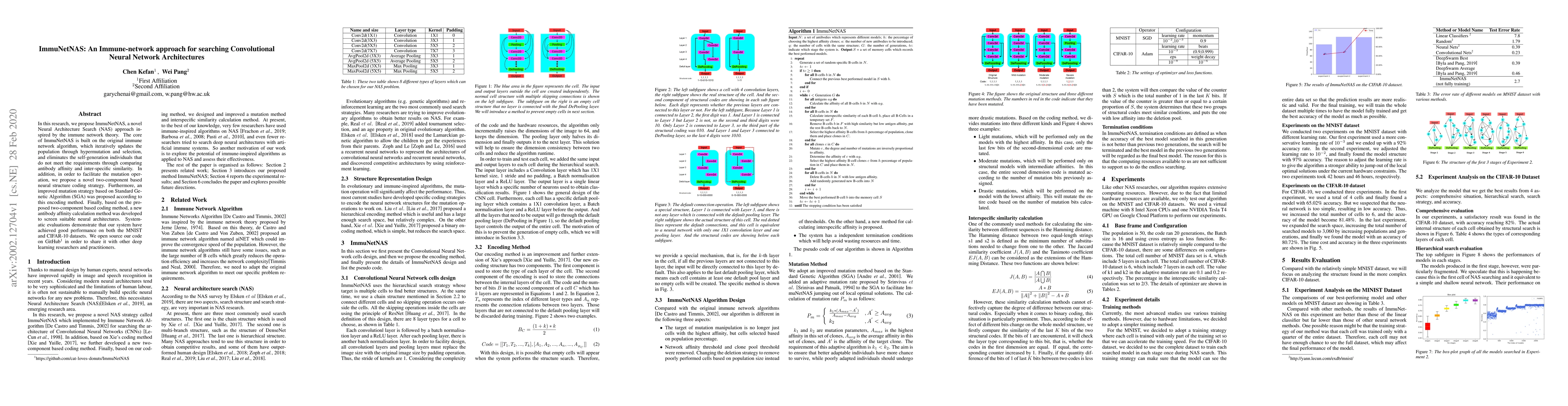In this research, we propose ImmuNetNAS, a novel Neural Architecture Search (NAS) approach inspired by the immune network theory. The core of ImmuNetNAS is built on the original immune network algorithm, which iteratively updates the population through hypermutation and selection, and eliminates the self-generation individuals that do not meet the requirements through comparing antibody affinity and inter-specific similarity. In addition, in order to facilitate the mutation operation, we propose a novel two-component based neural structure coding strategy. Furthermore, an improved mutation strategy based on Standard Genetic Algorithm (SGA) was proposed according to this encoding method. Finally, based on the proposed two-component based coding method, a new antibody affinity calculation method was developed to screen suitable neural architectures. Systematic evaluations demonstrate that our system has achieved good performance on both the MNIST and CIFAR-10 datasets. We open-source our code on GitHub in order to share it with other deep learning researchers and practitioners.