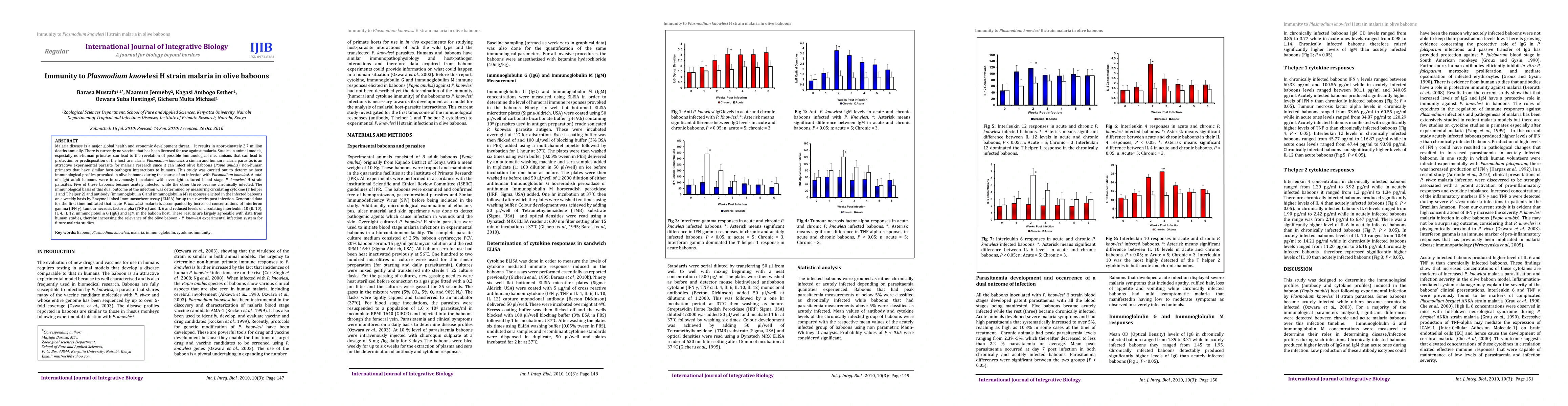 This study investigates the immunological responses in olive baboons infected with Plasmodium knowlesi H strain malaria, revealing acute infections are marked by elevated IFN-gamma, TNF-alpha, and IL-6, while chronic infections show different cytokine profiles, suggesting the baboon model's relevance for understanding human malaria.