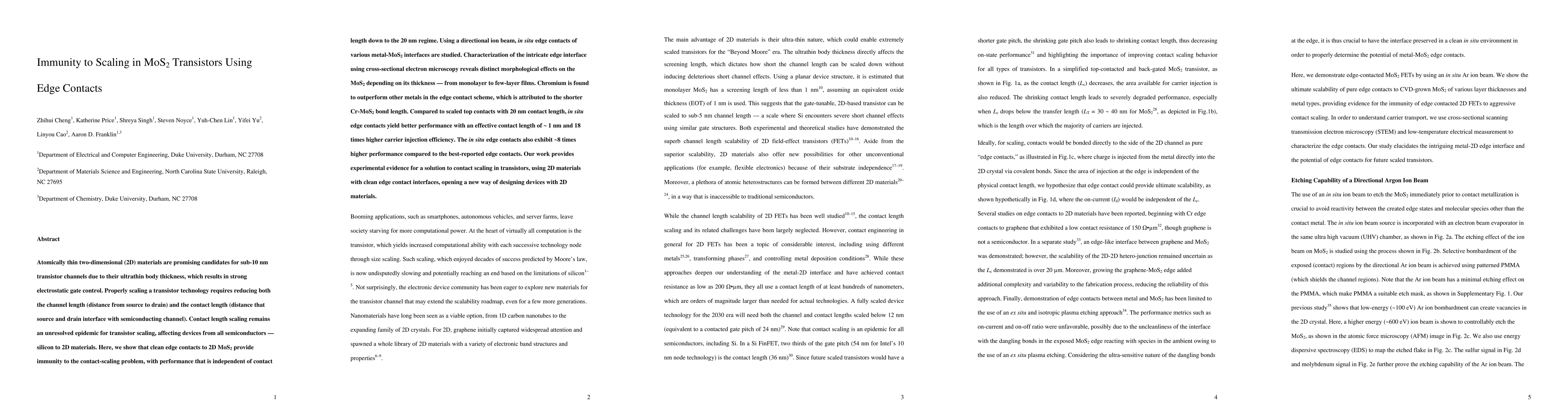 Atomically thin two-dimensional (2D) materials are promising candidates for sub-10 nm transistor channels due to their ultrathin body thickness, which results in strong electrostatic gate control. Properly scaling a transistor technology requires reducing both the channel length (distance from source to drain) and the contact length (distance that source and drain interface with semiconducting channel). Contact length scaling remains an unresolved epidemic for transistor scaling, affecting devices from all semiconductors, from silicon to 2D materials. Here, we show that clean edge contacts to 2D MoS2 provide immunity to the contact-scaling problem, with performance that is independent of contact length down to the 20 nm regime. Using a directional ion beam, in situ edge contacts of various metal-MoS2 interfaces are studied. Characterization of the intricate edge interface using cross-sectional electron microscopy reveals distinct morphological effects on the MoS2 depending on its thickness, from monolayer to few-layer films. Chromium is found to outperform other metals in the edge contact scheme, which is attributed to the shorter Cr-MoS2 bond length. Compared to scaled top contacts with 20 nm contact length, in situ edge contacts yield better performance with an effective contact length of ~ 1 nm and 18 times higher carrier injection efficiency. The in situ edge contacts also exhibit ~8 times higher performance compared to the best-reported edge contacts. Our work provides experimental evidence for a solution to contact scaling in transistors, using 2D materials with clean edge contact interfaces, opening a new way of designing devices with 2D materials.