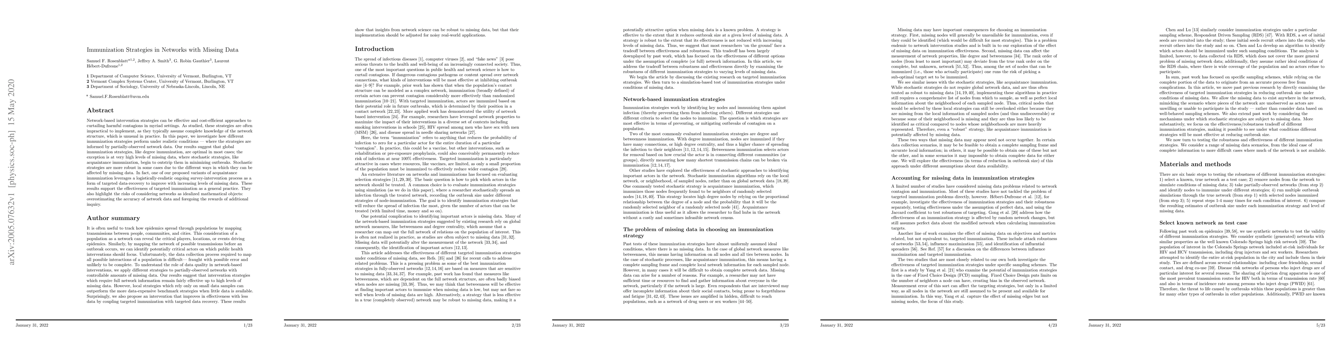 This paper examines immunization strategies in networks where data is incomplete, finding that global strategies like degree immunization are generally effective, except at very high levels of missing data where stochastic approaches like acquaintance immunization outperform. The study highlights the importance of targeted data recovery and the risks of relying too heavily on idealized network models.