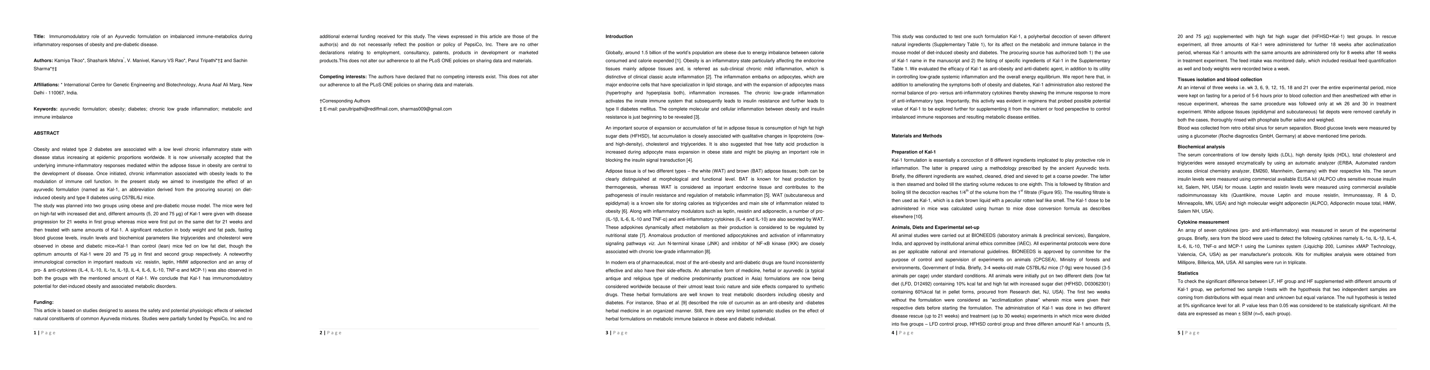 An Ayurvedic formulation called Kal-1 reduced body weight, glucose levels, and inflammation in mice with obesity and pre-diabetes, suggesting it has immunomodulatory potential for diet-induced metabolic disorders.