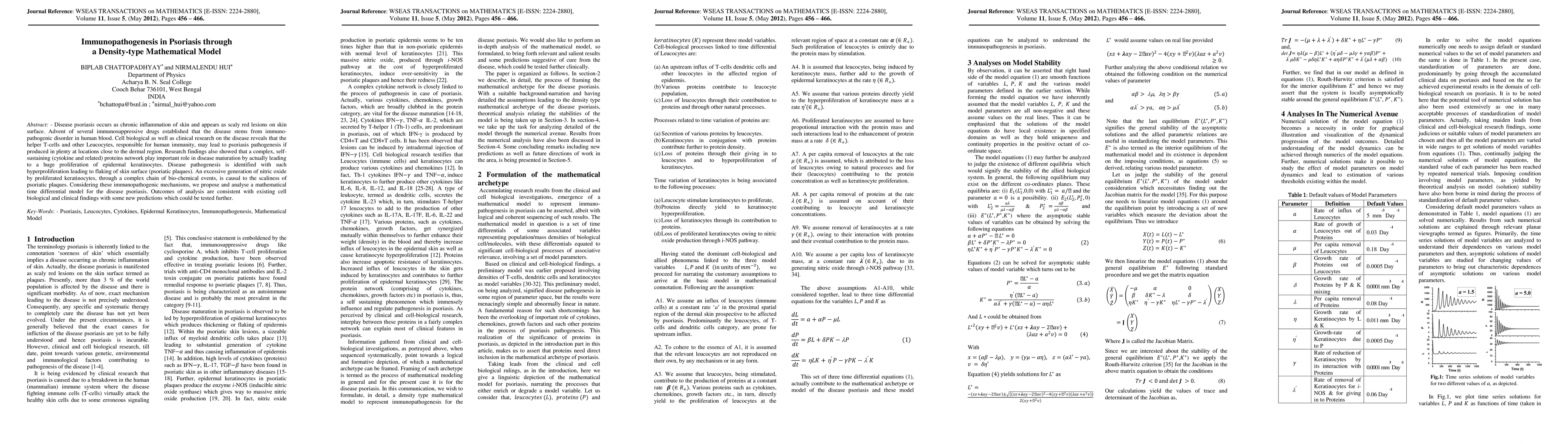 Disease psoriasis occurs as chronic inflammation of skin and appears as scaly red lesions on skin surface. Advent of several immunosuppressive drugs established that the disease stems from immuno-pathogenic disorder in human blood. Cell biological as well as clinical research on the disease reveals that the helper T-cells and other Leucocytes, responsible for human immunity, may lead to psoriasis pathogenesis if produced in plenty at locations close to the dermal region. Research findings also showed that a complex, self-sustaining (cytokine and related) proteins network play important role in disease maturation by actually leading to a huge proliferation of epidermal keratinocytes. Disease pathogenesis is identified with such hyperproliferation leading to flaking of skin surface (psoriatic plaques). An excessive generation of nitric oxide by proliferated keratinocytes, through a complex chain of bio-chemical events, is causal to the scaliness of psoriatic plaques. Considering these immunopathogenic mechanisms, we propose and analyse a mathematical time differential model for the disease psoriasis. Outcomes of analysis are consistent with existing cell biological and clinical findings with some new predictions which could be tested further.