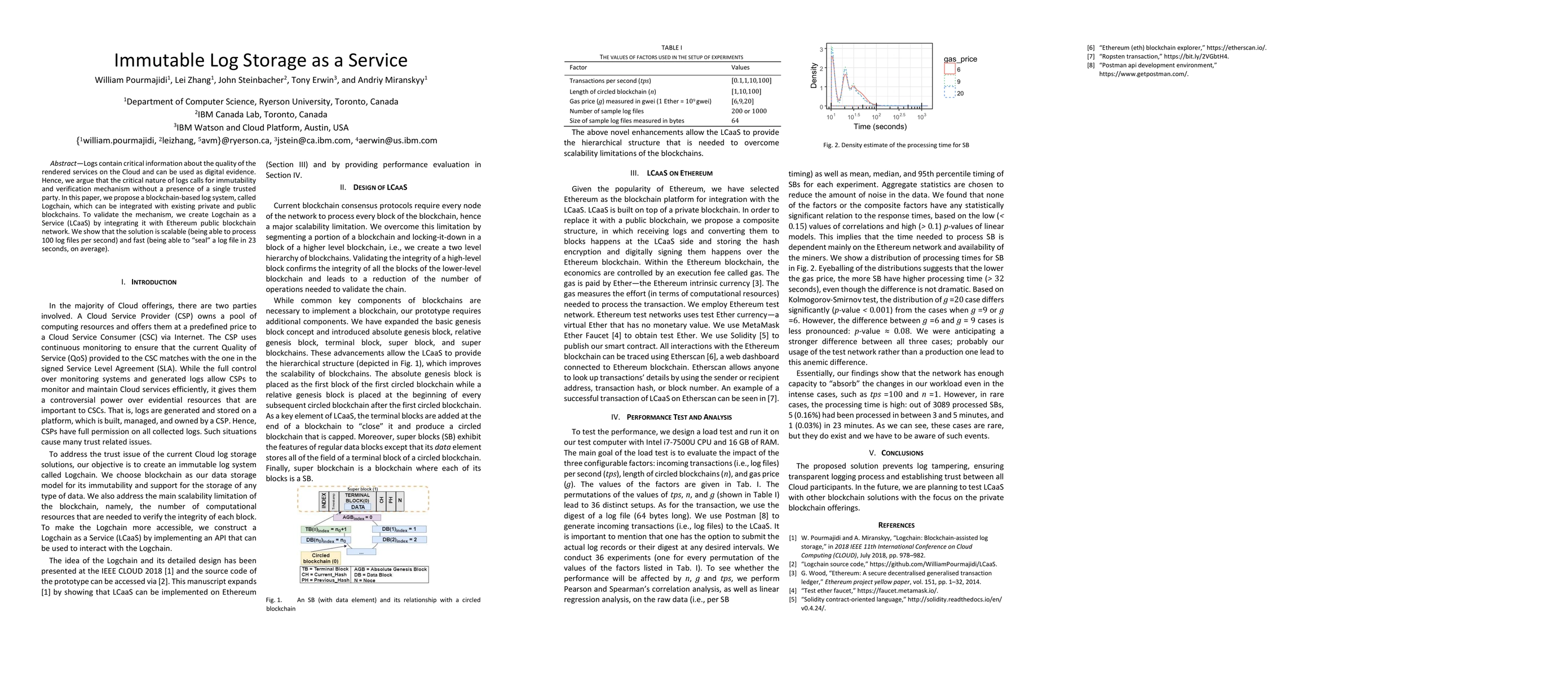 This paper proposes Logchain, a blockchain-based system for immutable log storage, ensuring log integrity and digital evidence without a single trusted party. The solution, implemented as Logchain as a Service (LCaaS) on the Ethereum blockchain, demonstrates scalability and efficiency, processing 100 logs per second and sealing files in 23 seconds on average.