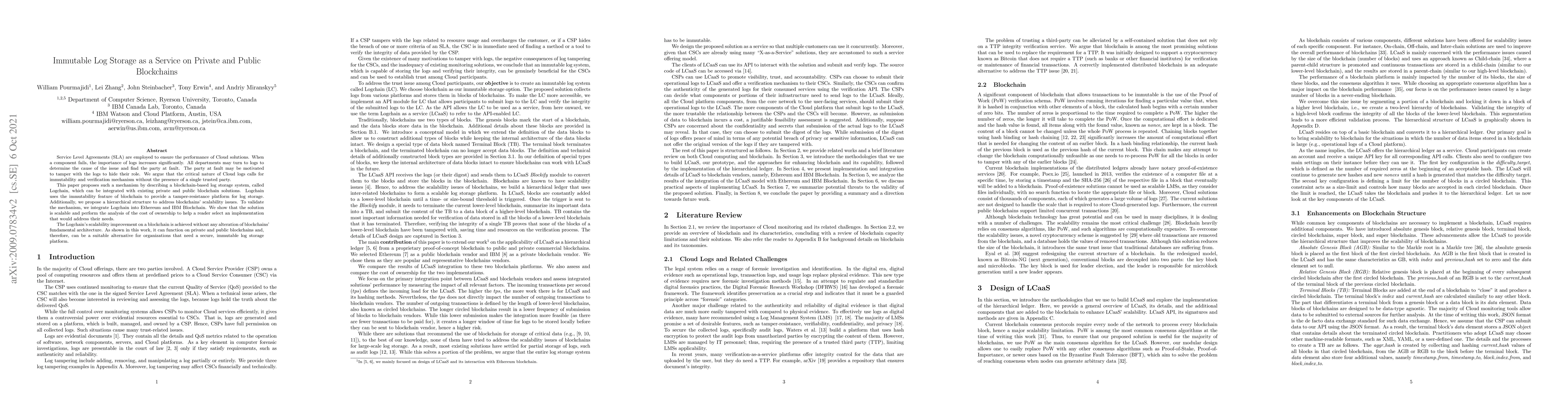 This paper proposes Logchain, a blockchain-based log storage system that ensures immutability and verification of Cloud logs without relying on a single trusted party. It integrates with private and public blockchains, addressing scalability issues through a hierarchical structure.