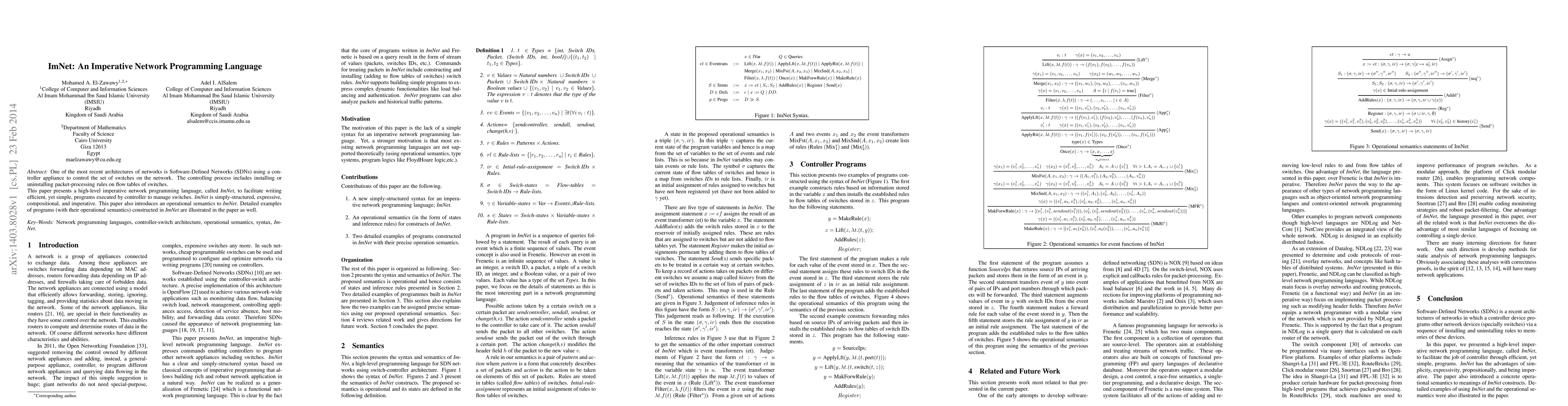 ImNet is a high-level imperative network programming language designed to simplify the management of Software-Defined Networks (SDNs) by enabling efficient and straightforward controller programs. The paper also provides an operational semantics and detailed examples of ImNet programs.