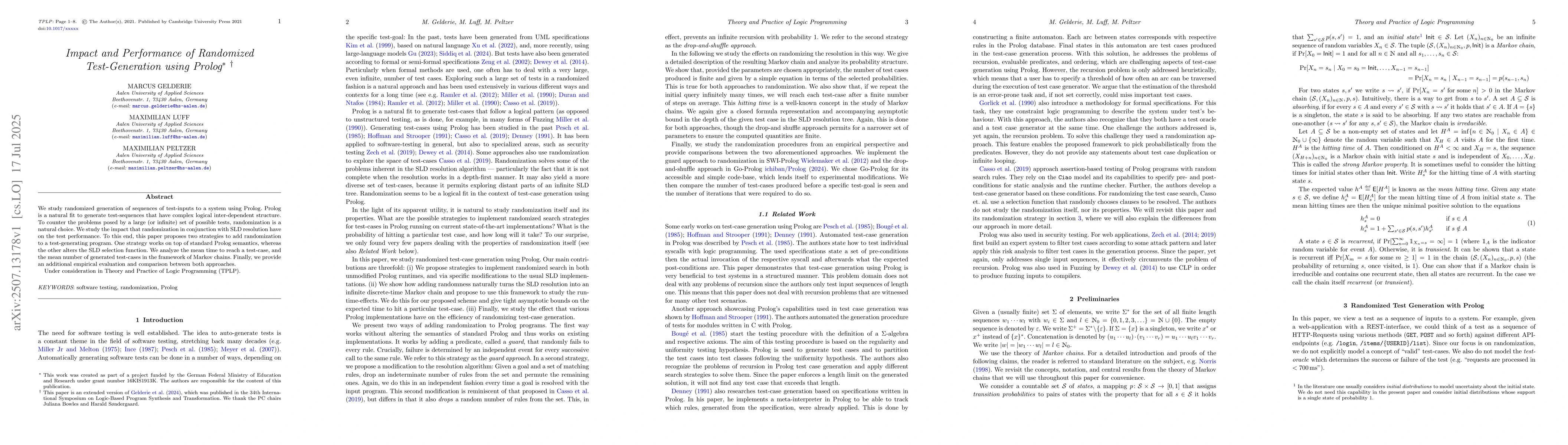 We study randomized generation of sequences of test-inputs to a system using Prolog. Prolog is a natural fit to generate test-sequences that have complex logical inter-dependent structure. To counter the problems posed by a large (or infinite) set of possible tests, randomization is a natural choice. We study the impact that randomization in conjunction with SLD resolution have on the test performance. To this end, this paper proposes two strategies to add randomization to a test-generating program. One strategy works on top of standard Prolog semantics, whereas the other alters the SLD selection function. We analyze the mean time to reach a test-case, and the mean number of generated test-cases in the framework of Markov chains. Finally, we provide an additional empirical evaluation and comparison between both approaches. Under consideration in Theory and Practice of Logic Programming (TPLP).