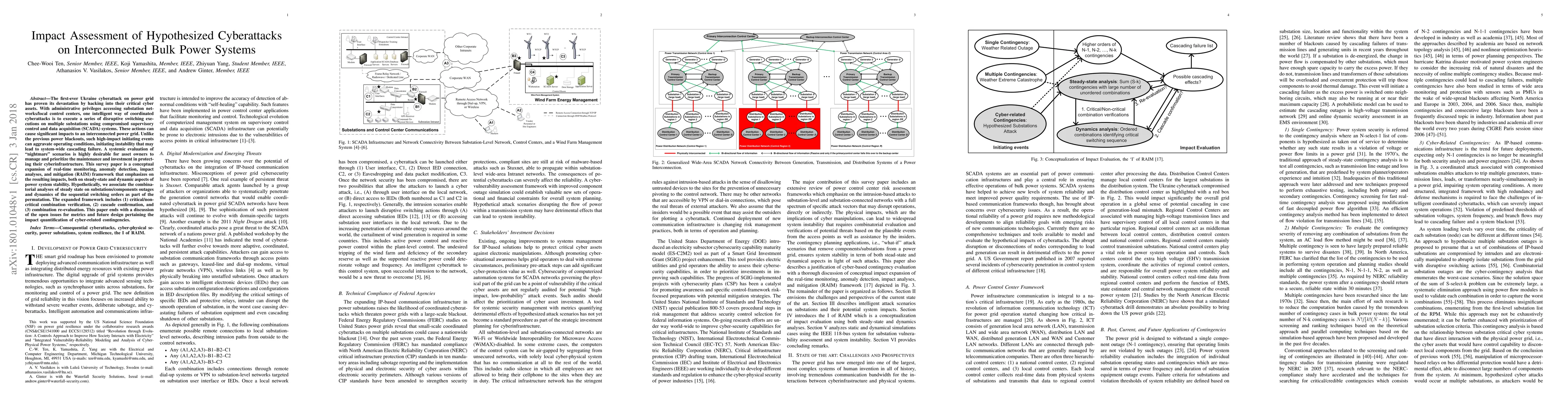 The first-ever Ukraine cyberattack on power grid has proven its devastation by hacking into their critical cyber assets. With administrative privileges accessing substation networks/local control centers, one intelligent way of coordinated cyberattacks is to execute a series of disruptive switching executions on multiple substations using compromised supervisory control and data acquisition (SCADA) systems. These actions can cause significant impacts to an interconnected power grid. Unlike the previous power blackouts, such high-impact initiating events can aggravate operating conditions, initiating instability that may lead to system-wide cascading failure. A systemic evaluation of "nightmare" scenarios is highly desirable for asset owners to manage and prioritize the maintenance and investment in protecting their cyberinfrastructure. This survey paper is a conceptual expansion of real-time monitoring, anomaly detection, impact analyses, and mitigation (RAIM) framework that emphasizes on the resulting impacts, both on steady-state and dynamic aspects of power system stability. Hypothetically, we associate the combinatorial analyses of steady state on substations/components outages and dynamics of the sequential switching orders as part of the permutation. The expanded framework includes (1) critical/noncritical combination verification, (2) cascade confirmation, and (3) combination re-evaluation. This paper ends with a discussion of the open issues for metrics and future design pertaining the impact quantification of cyber-related contingencies.