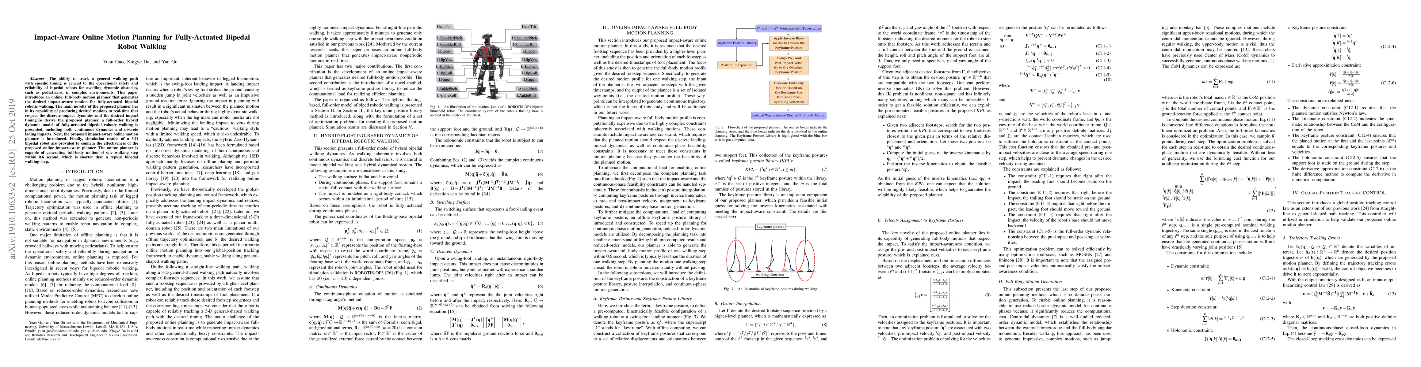 The ability to track a general walking path with specific timing is crucial to the operational safety and reliability of bipedal robots for avoiding dynamic obstacles, such as pedestrians, in complex environments. This paper introduces an online, full-body motion planner that generates the desired impact-aware motion for fully-actuated bipedal robotic walking. The main novelty of the proposed planner lies in its capability of producing desired motions in real-time that respect the discrete impact dynamics and the desired impact timing. To derive the proposed planner, a full-order hybrid dynamic model of fully-actuated bipedal robotic walking is presented, including both continuous dynamics and discrete lading impacts. Next, the proposed impact-aware online motion planner is introduced. Finally, simulation results of a 3-D bipedal robot are provided to confirm the effectiveness of the proposed online impact-aware planner. The online planner is capable of generating full-body motion of one walking step within 0.6 second, which is shorter than a typical bipedal walking step.