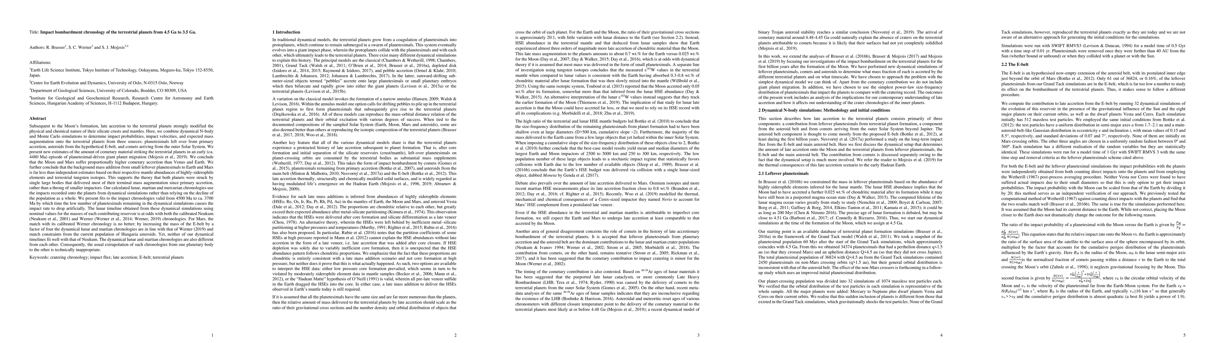 Subsequent to the Moon's formation, late accretion to the terrestrial planets modified their silicate crusts and mantles. We combine dynamical N-body and Monte Carlo simulations to determine impact probabilities, impact velocities, and expected mass augmentation onto the terrestrial planets from three sources: planetesimals left over from primary accretion, asteroids from the E-belt, and comets arriving from the outer Solar System. We present estimates of the amount of cometary material striking the terrestrial planets in an early episode of planetesimal-driven giant planet migration (Mojzsis et al., 2019). The Moon and Mars suffer proportionally higher cometary accretion than Venus and Earth. The background mass addition from small leftover planetesimals to Earth and Mars is far less than independent estimates based on their mantle abundances of highly-siderophile elements. This supports the theory that both planets were struck by single large bodies that delivered most of their mass augmentation since primary accretion. We present fits to the impact chronologies valid from 4500 Ma to ca. 3700 Ma. The lunar timeline thus obtained is at odds with both the calibrated Neukum (Neukum et al., 2001) and Werner (Werner et al., 2014; Werner, 2019) chronologies. For Mars, the match with its calibrated Werner chronology is no better; by increasing the mass of the E-belt by a factor of four the dynamical lunar and martian chronologies are in line with that of Werner (2019) and match constraints from the current population of Hungaria asteroids. Yet, neither of our dynamical timelines fit well with that of Neukum. The dynamical lunar and martian chronologies are also different from each other. Consequently, the usual extrapolation of such chronologies from one planetary body to the other is technically inappropriate.