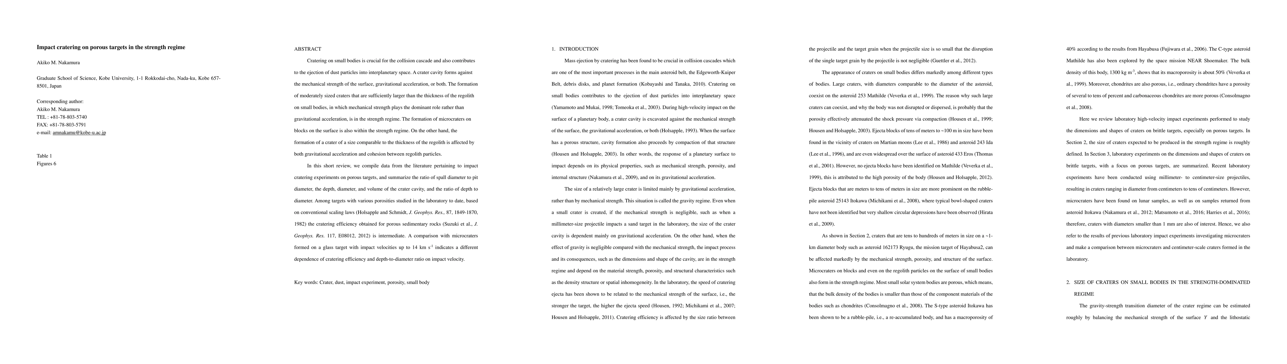 Cratering on small bodies is crucial for the collision cascade and also contributes to the ejection of dust particles into interplanetary space. A crater cavity forms against the mechanical strength of the surface, gravitational acceleration, or both. The formation of moderately sized craters that are sufficiently larger than the thickness of the regolith on small bodies, in which mechanical strength plays the dominant role rather than gravitational acceleration, is in the strength regime. The formation of microcraters on blocks on the surface is also within the strength regime. On the other hand, the formation of a crater of a size comparable to the thickness of the regolith is affected by both gravitational acceleration and cohesion between regolith particles. In this short review, we compile data from the literature pertaining to impact cratering experiments on porous targets, and summarize the ratio of spall diameter to pit diameter, the depth, diameter, and volume of the crater cavity, and the ratio of depth to diameter. Among targets with various porosities studied in the laboratory to date, based on conventional scaling laws (Holsapple and Schmidt, J. Geophys. Res., 87, 1849-1870, 1982) the cratering efficiency obtained for porous sedimentary rocks (Suzuki et al., J. Geophys. Res. 117, E08012, 2012) is intermediate. A comparison with microcraters formed on a glass target with impact velocities up to 14 $km s^{-1}$ indicates a different dependence of cratering efficiency and depth-to-diameter ratio on impact velocity.