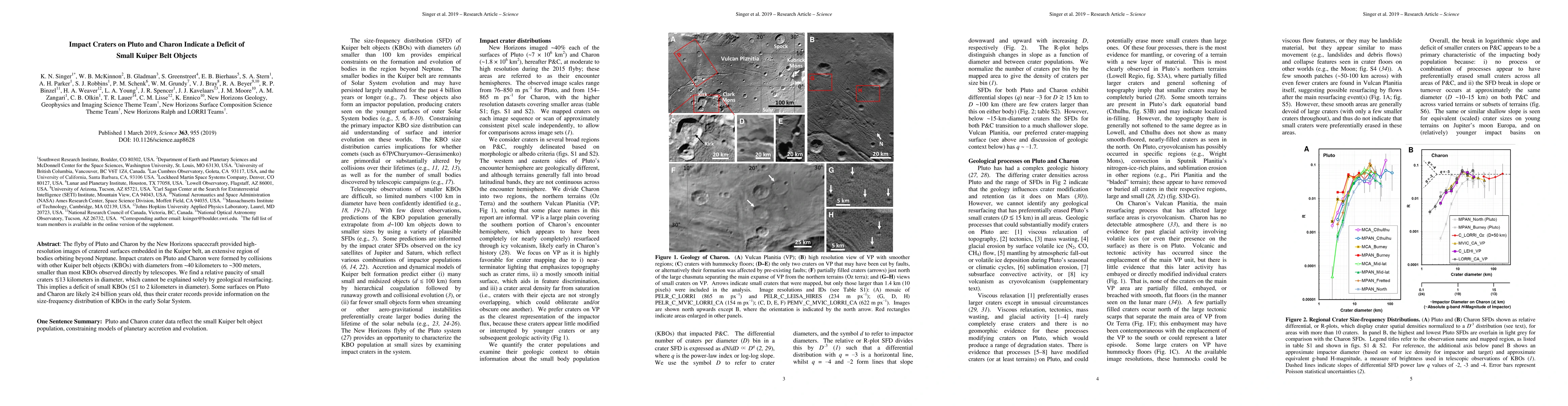 The flyby of Pluto and Charon by the New Horizons spacecraft provided high-resolution images of cratered surfaces embedded in the Kuiper belt, an extensive region of bodies orbiting beyond Neptune. Impact craters on Pluto and Charon were formed by collisions with other Kuiper belt objects (KBOs) with diameters from ~40 kilometers to ~300 meters, smaller than most KBOs observed directly by telescopes. We find a relative paucity of small craters less than approximately 13 kilometers in diameter, which cannot be explained solely by geological resurfacing. This implies a deficit of small KBOs (less than 1 to 2 kilometers in diameter). Some surfaces on Pluto and Charon are likely greater than 4 billion years old, thus their crater records provide information on the size-frequency distribution of KBOs in the early Solar System.