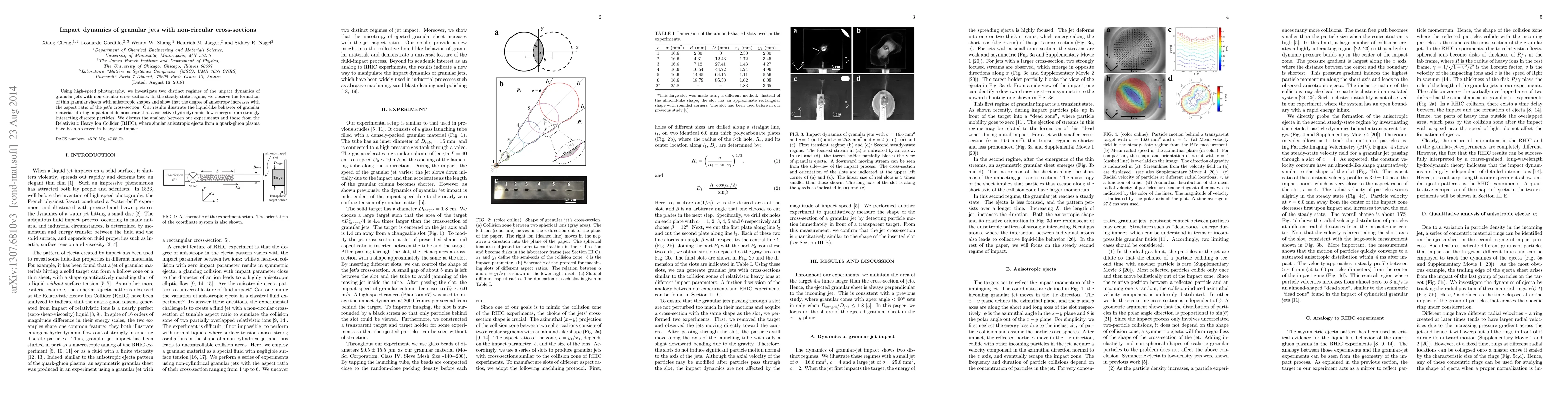 This study uses high-speed photography to explore two regimes of granular jets with non-circular cross-sections, revealing the formation of anisotropic granular sheets and a collective hydrodynamic flow, akin to observations in heavy-ion collisions at RHIC. The degree of anisotropy increases with the jet's aspect ratio, highlighting the liquid-like behavior of granular materials during impact.