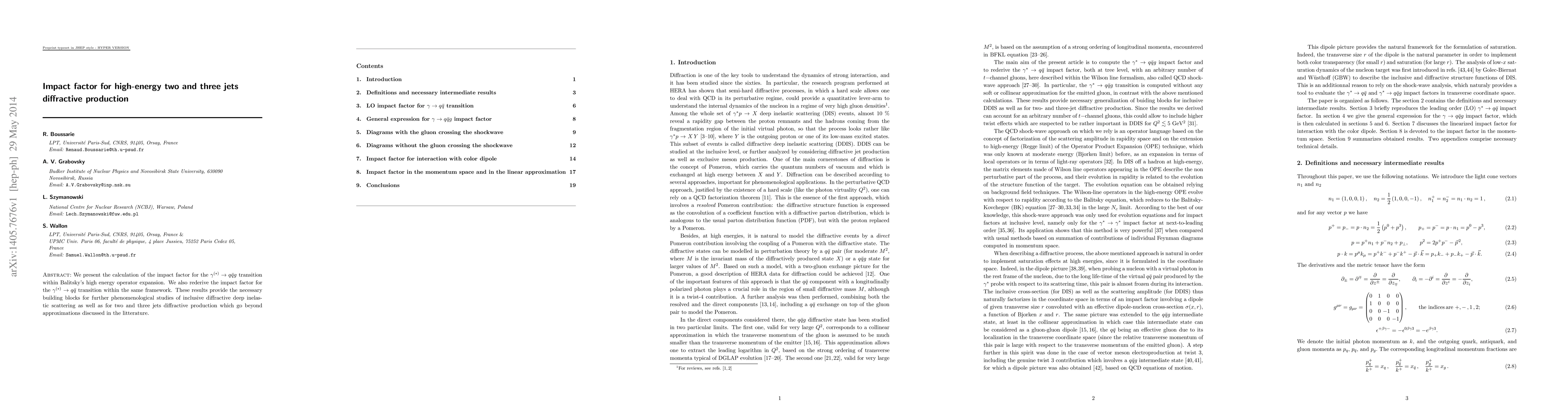We present the calculation of the impact factor for the gamma(*) -> q qb g transition within Balitsky's high energy operator expansion. We also rederive the impact factor for the gamma(*) -> q qb transition within the same framework. These results provide the necessary building blocks for further phenomenological studies of inclusive diffractive deep inelastic scattering as well as for two and three jets diffractive production which go beyond approximations discussed in the litterature.