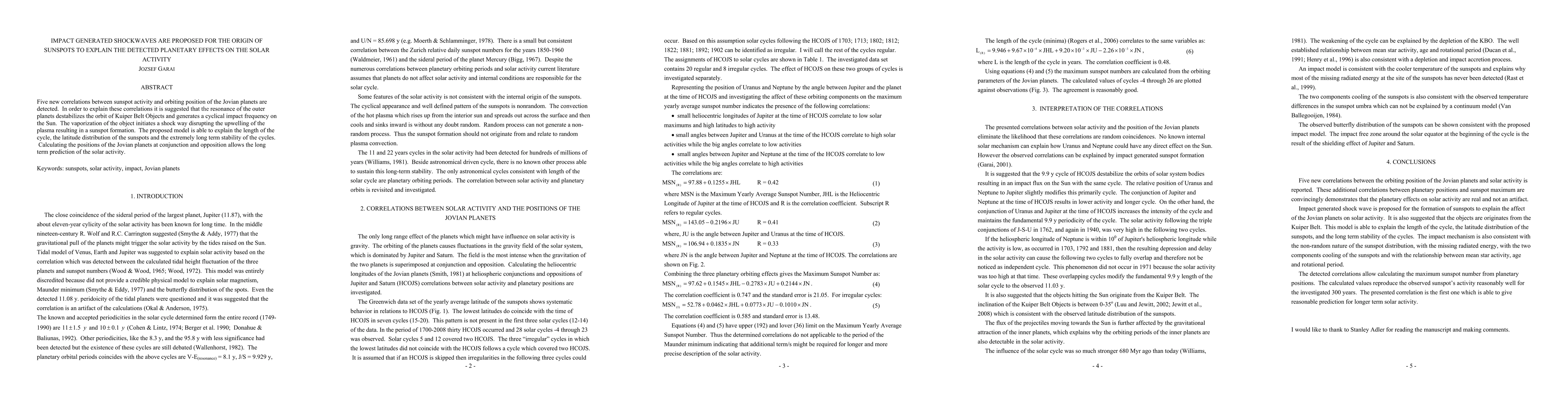 Five new correlations between sunspot activity and orbiting position of the Jovian planets are detected. In order to explain these correlations it is suggested that the resonance of the outer planets destabilizes the orbit of Kuiper Belt Objects and generates a cyclical impact frequency on the Sun. The vaporization of the object initiates a shock way disrupting the upwelling of the plasma resulting in a sunspot formation. The proposed model is able to explain the length of the cycle, the latitude distribution of the sunspots and the extremely long term stability of the cycles. Calculating the positions of the Jovian planets at conjunction and opposition allows the long term prediction of the solar activity.