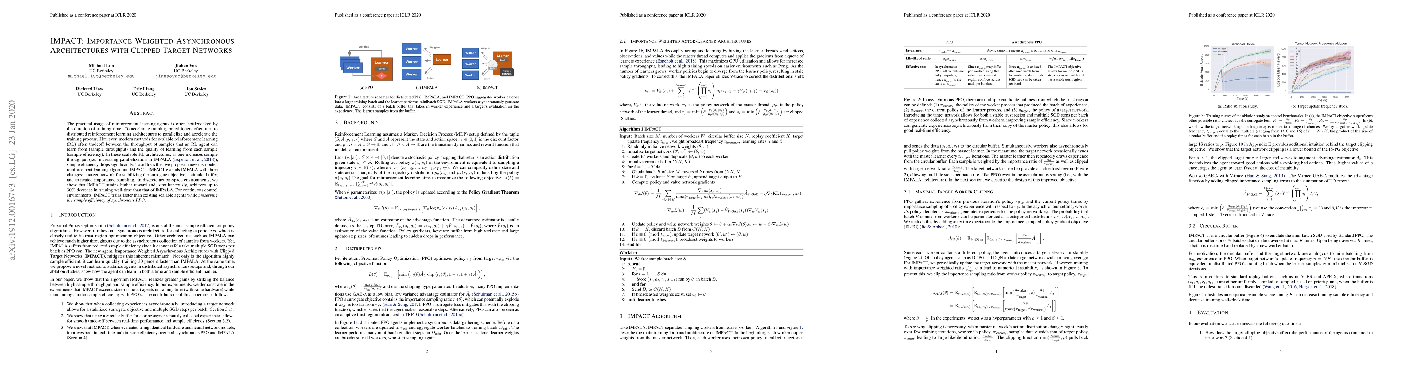 The practical usage of reinforcement learning agents is often bottlenecked by the duration of training time. To accelerate training, practitioners often turn to distributed reinforcement learning architectures to parallelize and accelerate the training process. However, modern methods for scalable reinforcement learning (RL) often tradeoff between the throughput of samples that an RL agent can learn from (sample throughput) and the quality of learning from each sample (sample efficiency). In these scalable RL architectures, as one increases sample throughput (i.e. increasing parallelization in IMPALA), sample efficiency drops significantly. To address this, we propose a new distributed reinforcement learning algorithm, IMPACT. IMPACT extends IMPALA with three changes: a target network for stabilizing the surrogate objective, a circular buffer, and truncated importance sampling. In discrete action-space environments, we show that IMPACT attains higher reward and, simultaneously, achieves up to 30% decrease in training wall-time than that of IMPALA. For continuous control environments, IMPACT trains faster than existing scalable agents while preserving the sample efficiency of synchronous PPO.