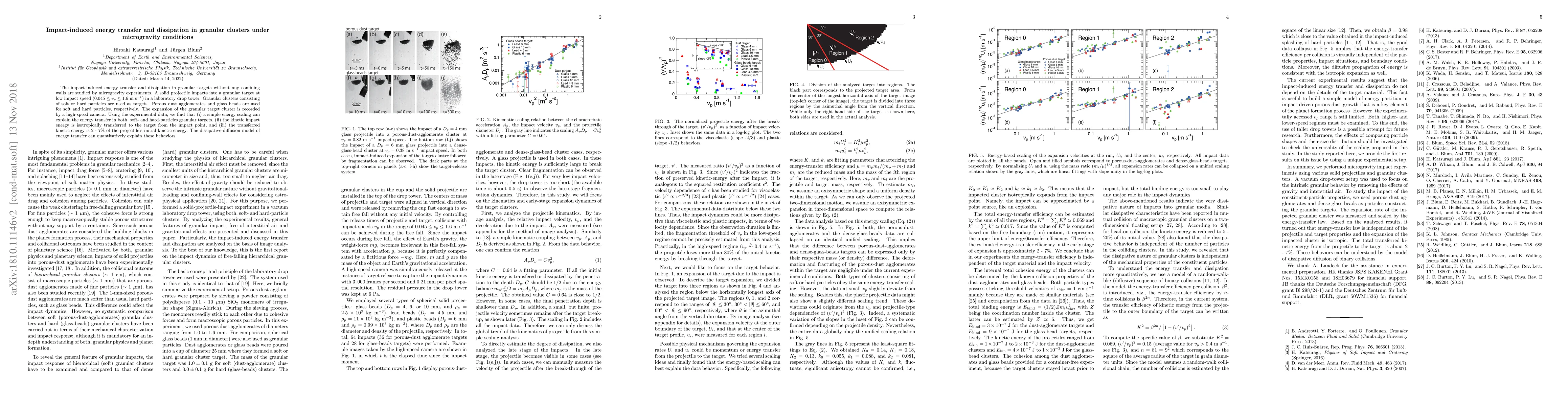 This study investigates the energy transfer and dissipation in granular clusters under microgravity conditions, using projectile impacts at low speeds. Results show consistent energy scaling across soft and hard granular targets, isotropic energy distribution, and energy transfer efficiency of 2%-7%, explained by a dissipative-diffusion model.