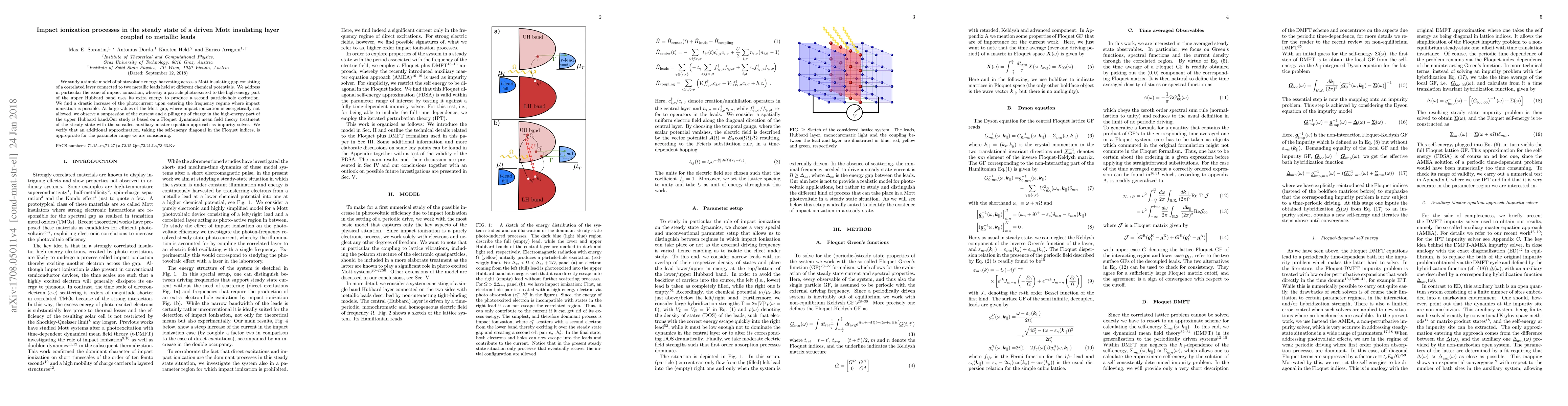 We study a simple model of photovoltaic energy harvesting across a Mott insulating gap consisting of a correlated layer connected to two metallic leads held at different chemical potentials. Upon driving the layer with a time periodic electric field a particle current is induced from the low-energy to the high-energy lead. We address in particular the issue of impact ionization, whereby a particle photoexcited to the high-energy part of the upper Hubbard band uses its extra energy to produce a second particle-hole excitation. We find a drastic increase of the photocurrent upon entering the frequency regime where impact ionization is possible. At large values of the Mott gap, where impact ionization is energetically not allowed, we observe a suppression of the current and a piling up of charge in the high-energy part of the upper Hubbard band. Our study is based on a Floquet-DMFT treatment with the so-called auxiliary master equation approach as impurity solver. We verify that an approximation, whereby the self-energy is taken diagonal in the Floquet indices, is appropriate for the parameter range we are considering.