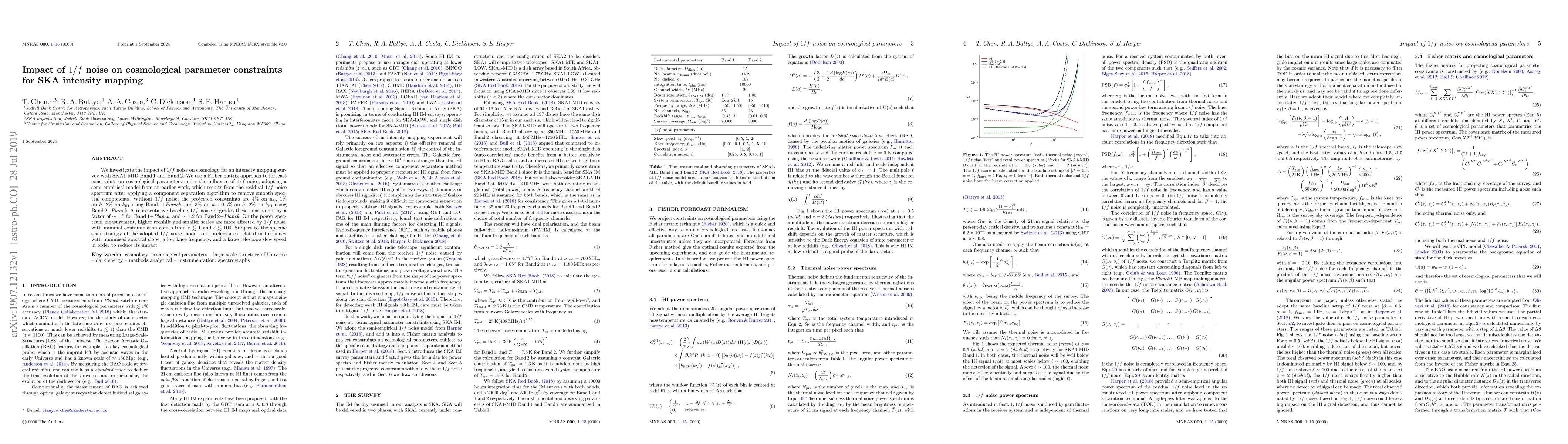 This paper examines how $1/f$ noise affects cosmological parameter constraints in an intensity mapping survey using SKA1-MID Band 1 and Band 2. It finds that $1/f$ noise degrades parameter constraints by a factor of 1.5 for Band 1 and 1.2 for Band 2, with higher redshifts and smaller scales being more impacted.