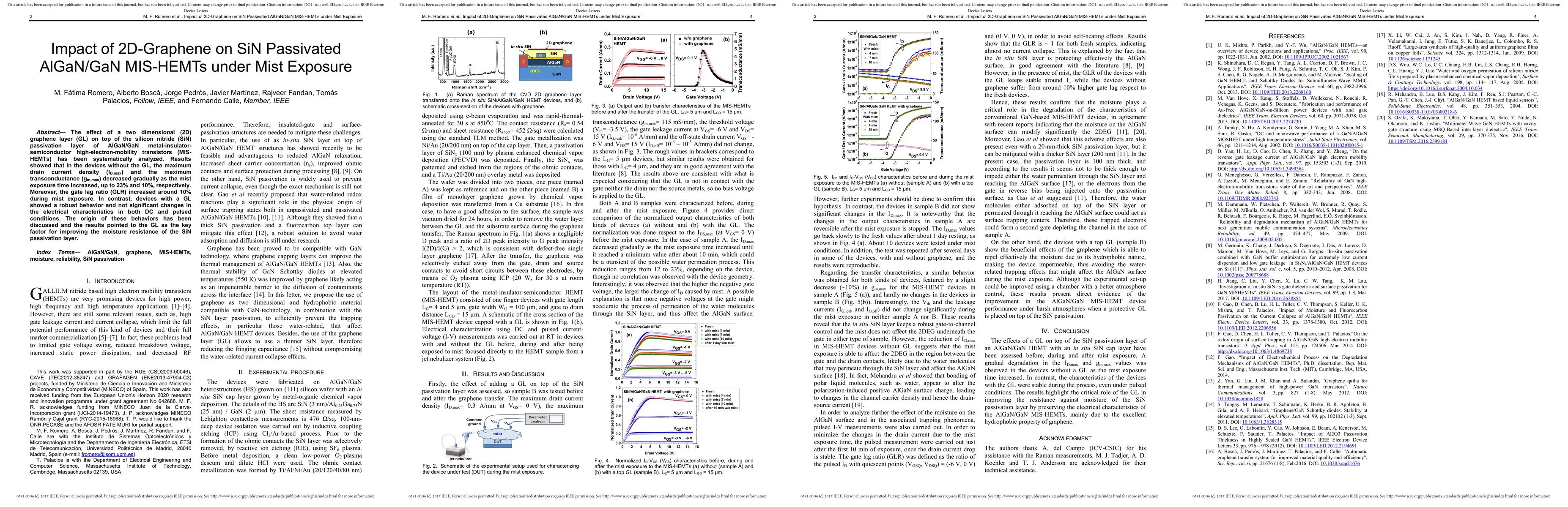 This study investigates the impact of a 2D graphene layer on the moisture resistance of AlGaN/GaN MIS-HEMTs with a SiN passivation layer. Devices without graphene showed significant degradation in performance under mist exposure, while those with graphene maintained stable electrical characteristics, indicating graphene enhances moisture resistance.