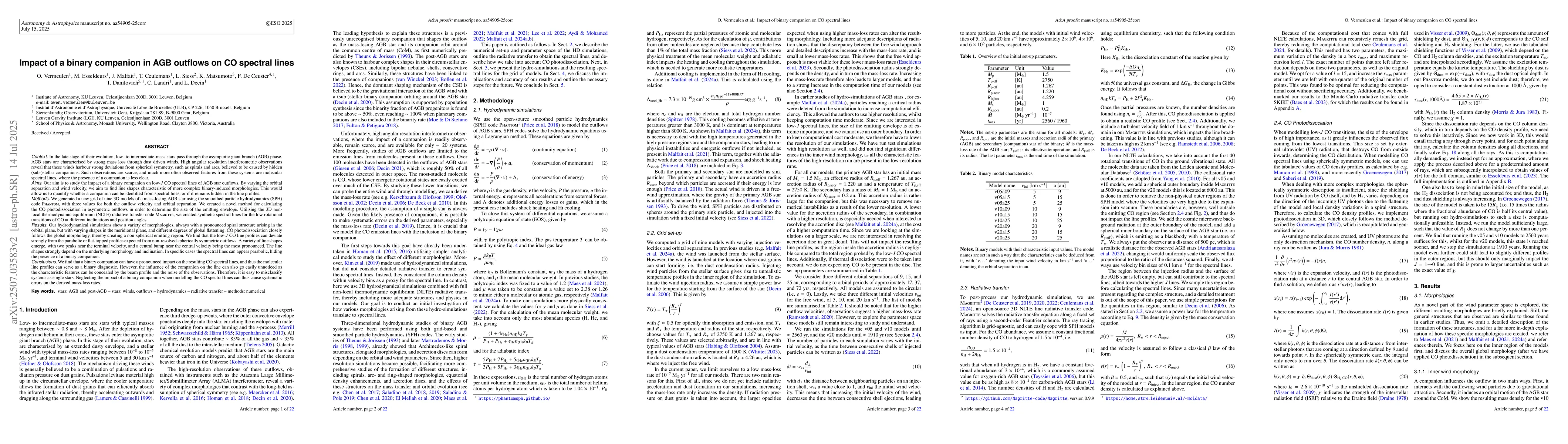 In the late stage of their evolution, low- to intermediate-mass stars pass through the asymptotic giant branch (AGB) phase, characterised by strong mass loss through dust driven winds. High angular resolution observations reveal that these winds harbour strong deviations from spherical symmetry, such as spirals and arcs, believed to be caused by hidden (sub-)stellar companions. Much more often, one observes spectral lines, where the presence of a companion is less clear. We study the impact of a binary companion on low-J CO spectral lines of AGB star outflows. By varying the orbital separation and wind velocity, we aim to find line shapes characteristic of more complex binary-induced morphologies. We generated a grid of nine 3D models of a mass-losing AGB star using the smoothed particle hydrodynamics code Phantom, with three values for both the outflow velocity and orbital separation. Utilising the radiative transfer code Magritte, we created synthetic spectral lines for the low rotational transitions of CO at different inclinations and position angles. Our simulations show a variety of morphologies, always with a pronounced spiral structure arising in the orbital plane, but with varying shapes in the meridional plane, and different degrees of global flattening. We find that the CO line profiles can deviate strongly from the parabolic or flat-topped profiles expected from spherically symmetric outflows. A variety of line shapes emerge, with two peaks near the terminal velocity, and a central bump near the central velocity being the most pronounced. In specific cases, the spectral lines can appear parabolic, hiding the presence of a binary companion. We find the CO spectral lines can serve as a binary diagnostic. The influence of the companion on the line can however also go easily unnoticed, as the features can be concealed by the beam profile and the noise of the observations.