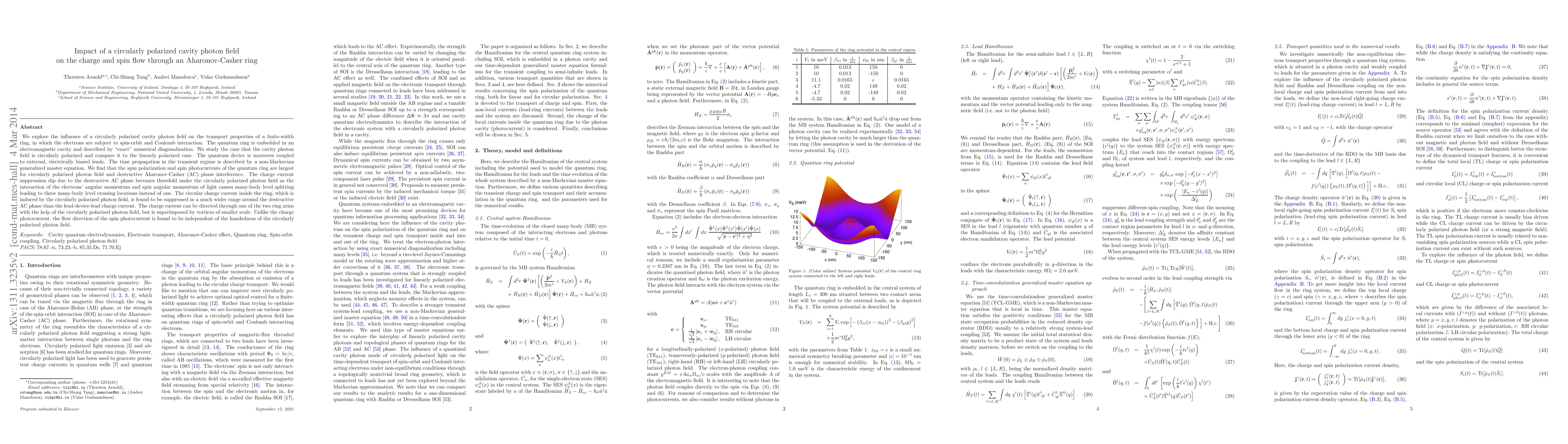We explore the influence of a circularly polarized cavity photon field on the transport properties of a finite-width ring, in which the electrons are subject to spin-orbit and Coulomb interaction. The quantum ring is embedded in an electromagnetic cavity and described by ``exact'' numerical diagonalization. We study the case that the cavity photon field is circularly polarized and compare it to the linearly polarized case. The quantum device is moreover coupled to external, electrically biased leads. The time propagation in the transient regime is described by a non-Markovian generalized master equation. We find that the spin polarization and spin photocurrents of the quantum ring are largest for circularly polarized photon field and destructive Aharonov-Casher (AC) phase interference. The charge current suppression dip due to the destructive AC phase becomes threefold under the circularly polarized photon field as the interaction of the electrons' angular momentum and spin angular momentum of light causes many-body level splitting leading to three many-body level crossing locations instead of one. The circular charge current inside the ring, which is induced by the circularly polarized photon field, is found to be suppressed in a much wider range around the destructive AC phase than the lead-device-lead charge current. The charge current can be directed through one of the two ring arms with the help of the circularly polarized photon field, but is superimposed by vortices of smaller scale. Unlike the charge photocurrent, the flow direction of the spin photocurrent is found to be independent of the handedness of the circularly polarized photon field.