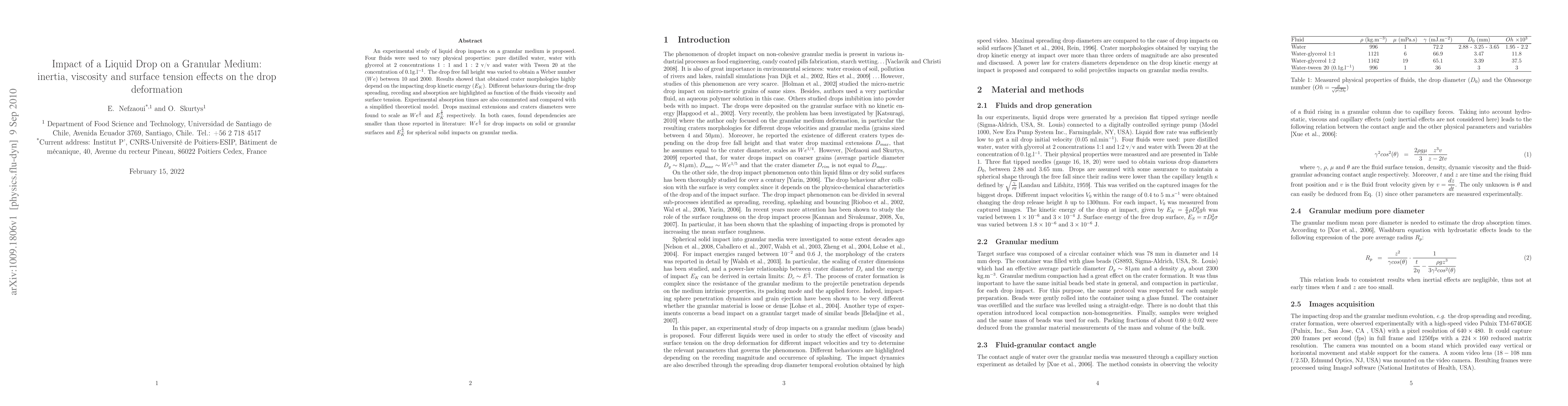 This study experimentally investigates the impact of liquid drops on a granular medium, varying the fluids' viscosity and surface tension. Results show that crater morphology and absorption times depend on kinetic energy, with scaling laws differing from those for impacts on solid surfaces.