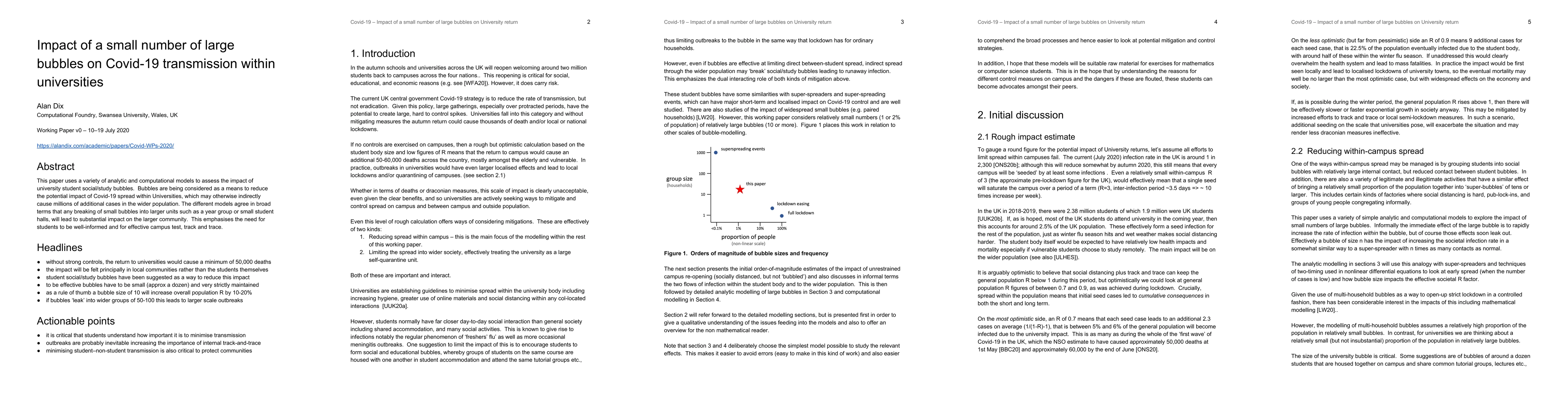 This paper uses a variety of analytic and computational models to assess the impact of university student social/study bubbles. Bubbles are being considered as a means to reduce the potential impact of Covid-19 spread within Universities, which may otherwise indirectly cause millions of additional cases in the wider population. The different models agree in broad terms that any breaking of small bubbles into larger units such as a year group or small student halls, will lead to substantial impact on the larger community. This emphasises the need for students to be well-informed and for effective campus test, track and trace.