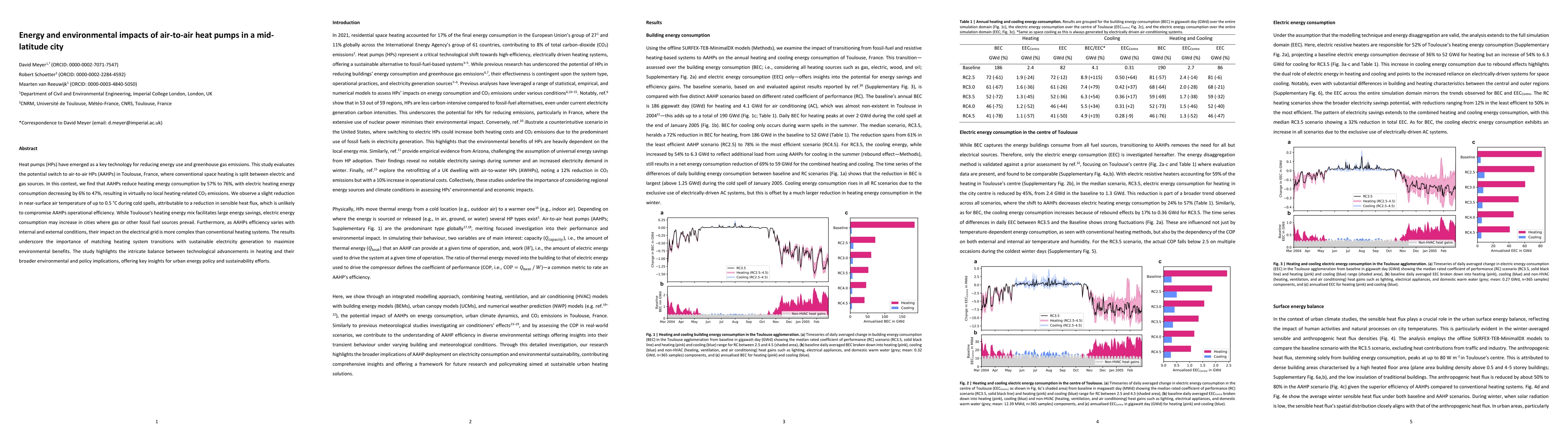 The study presents an integrated modeling approach combining the TEB model for urban climate simulations with the MinimalDX model for heat pump performance, providing a comprehensive analysis of AAHPs' impact on energy and climate.
