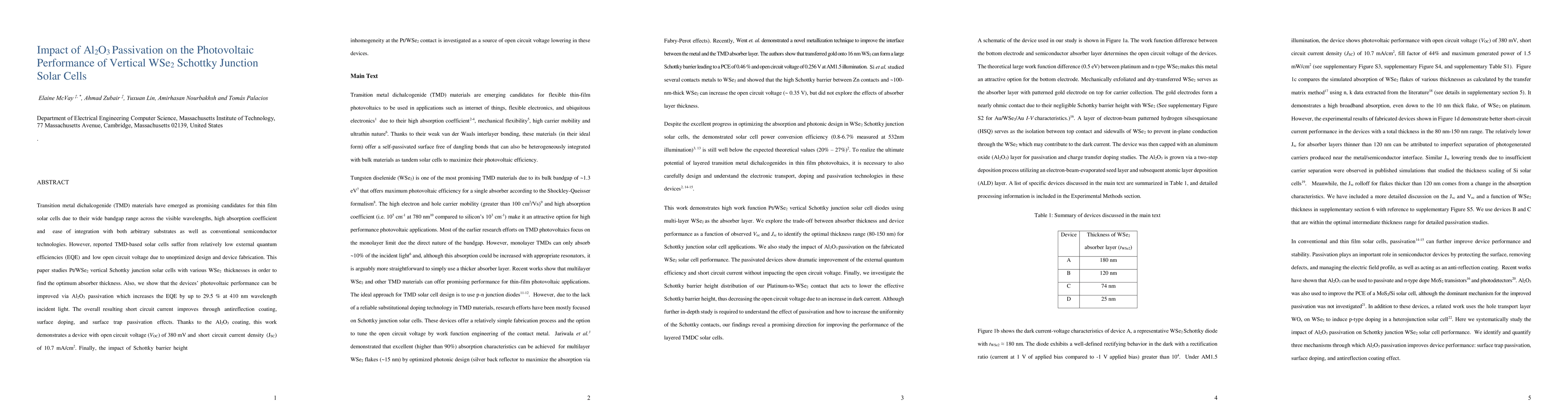 Transition metal dichalcogenide (TMD) materials have emerged as promising candidates for thin film solar cells due to their wide bandgap range across the visible wavelengths, high absorption coefficient and ease of integration with both arbitrary substrates as well as conventional semiconductor technologies. However, reported TMD-based solar cells suffer from relatively low external quantum efficiencies (EQE) and low open circuit voltage due to unoptimized design and device fabrication. This paper studies $Pt/WSe_2$ vertical Schottky junction solar cells with various $WSe_2$ thicknesses in order to find the optimum absorber thickness.Also, we show that the photovoltaic performance can be improved via $Al_2O_3$ passivation which increases the EQE by up to 29.5% at 410 nm wavelength incident light. The overall resulting short circuit current improves through antireflection coating, surface doping, and surface trap passivation effects. Thanks to the ${Al_2O_3}$ coating, this work demonstrates a device with open circuit voltage ($V_{OC}$) of 380 mV and short circuit current density ($J_{SC}$) of 10.7 $mA/cm^2$. Finally, the impact of Schottky barrier height inhomogeneity at the $Pt/WSe_2$ contact is investigated as a source of open circuit voltage lowering in these devices