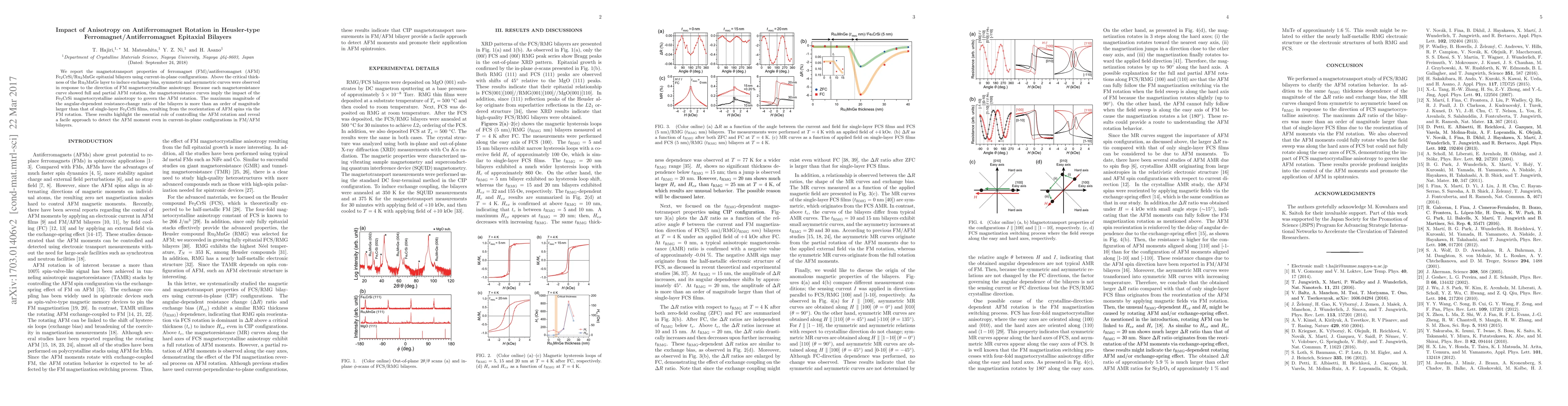 This study investigates the magnetotransport properties of Fe$_2$CrSi/Ru$_2$MnGe epitaxial bilayers, revealing that the Fe$_2$CrSi magnetocrystalline anisotropy significantly influences the rotation of Ru$_2$MnGe antiferromagnetic spins. The results show a substantial increase in angular-dependent resistance change, highlighting the potential for controlling antiferromagnetic rotation in bilayers.