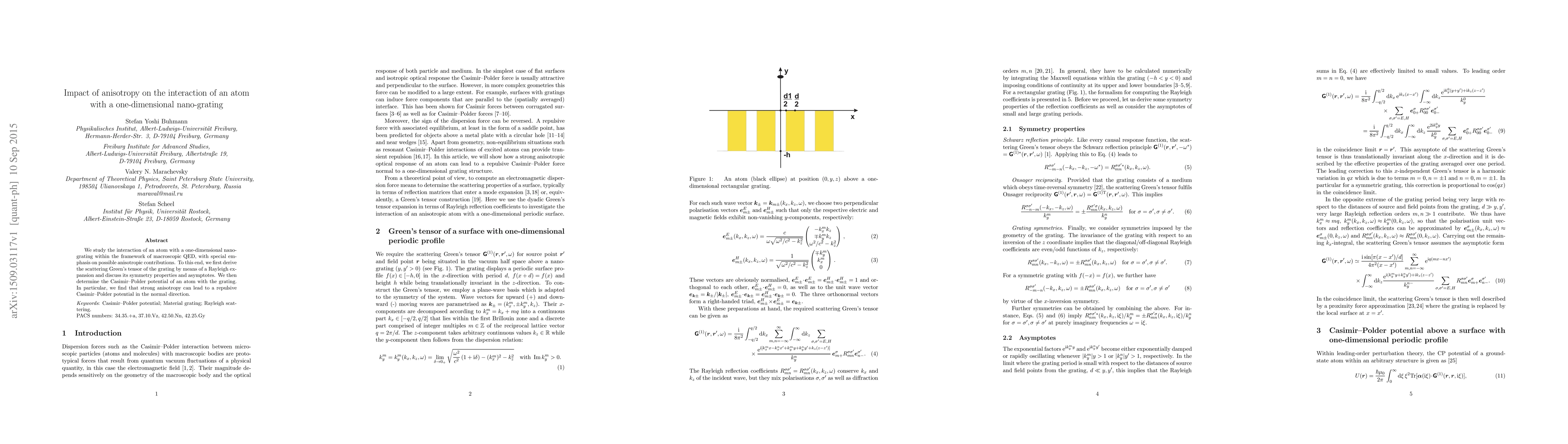 We study the interaction of an atom with a one-dimensional nano-grating within the framework of macroscopic QED, with special emphasis on possible anisotropic contributions. To this end, we first derive the scattering Green's tensor of the grating by means of a Rayleigh expansion and discuss its symmetry properties and asymptotes. We then determine the Casimir--Polder potential of an atom with the grating. In particular, we find that strong anisotropy can lead to a repulsive Casimir--Polder potential in the normal direction.