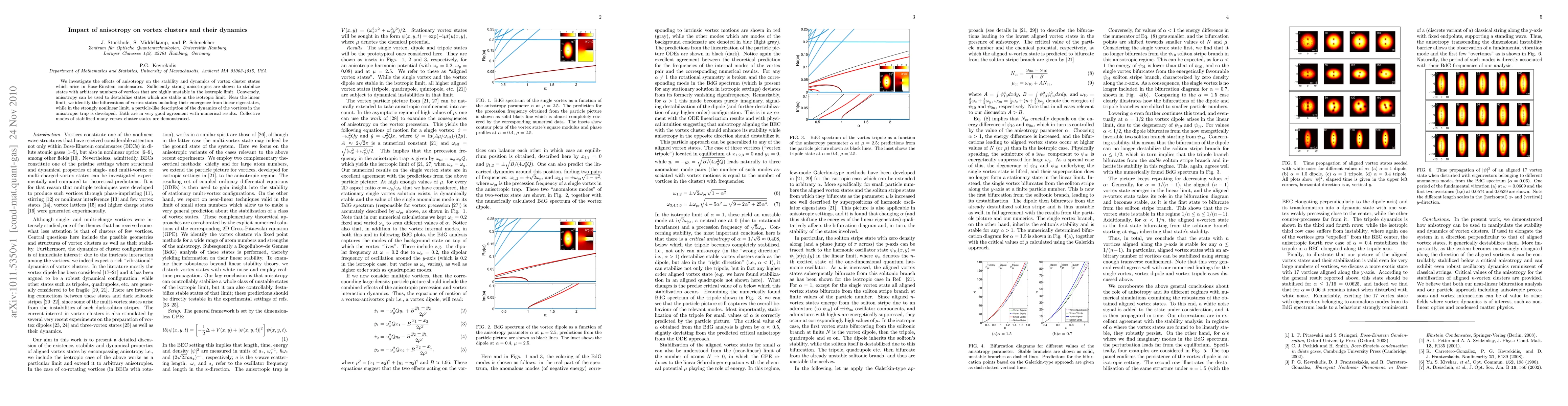 The research examines how anisotropy influences vortex clusters in Bose-Einstein condensates, stabilizing various vortex numbers unstable in isotropic conditions and destabilizing others. It identifies bifurcation points and develops a particle-like vortex dynamics model in anisotropic traps, corroborated by numerical results, demonstrating collective modes of many-vortex clusters.