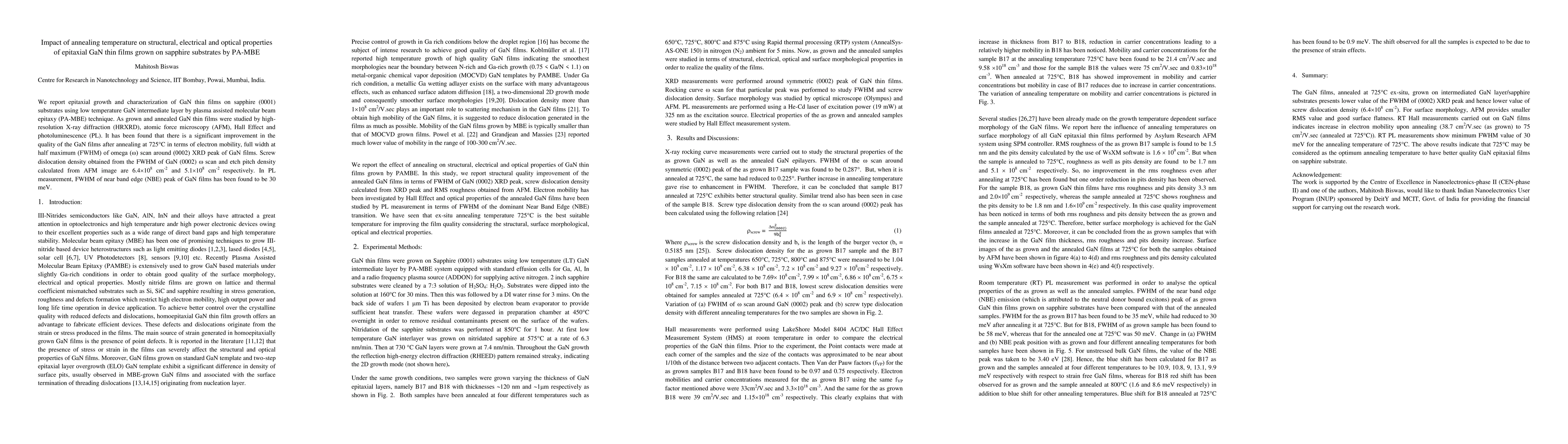 This study investigates the effects of annealing temperature on the structural, electrical, and optical properties of GaN thin films grown on sapphire substrates via PA-MBE. Results show significant improvements in electron mobility and reduced dislocation density after annealing at 725°C, with notable enhancements in optical properties as indicated by narrower photoluminescence peaks.