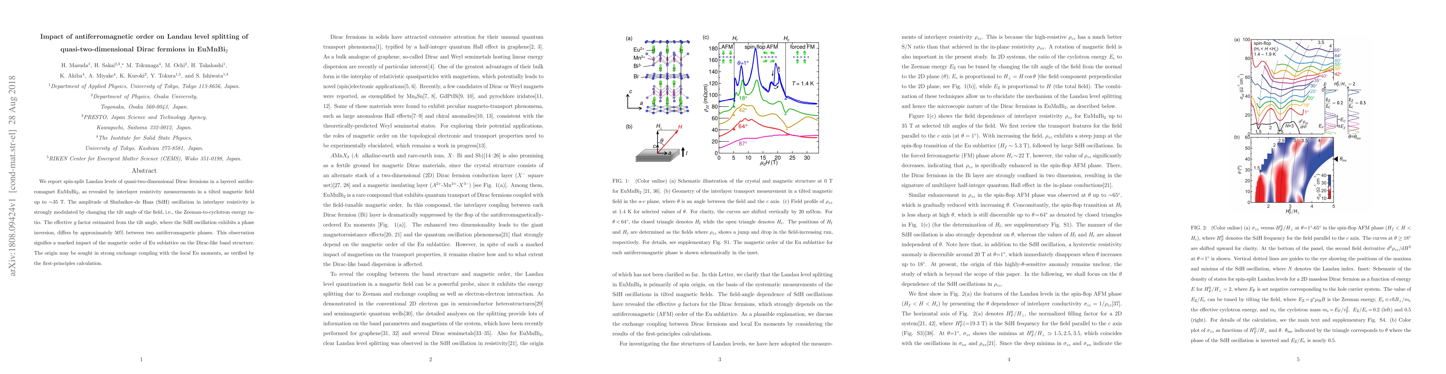 This study reveals spin-split Landau levels in quasi-two-dimensional Dirac fermions within the antiferromagnetic compound EuMnBi$_2$, showing significant modulation of Shubnikov-de Haas oscillations by magnetic field tilt. The effective $g$ factor varies by 50% between antiferromagnetic phases, indicating a strong influence of Eu sublattice magnetism on the Dirac band structure.