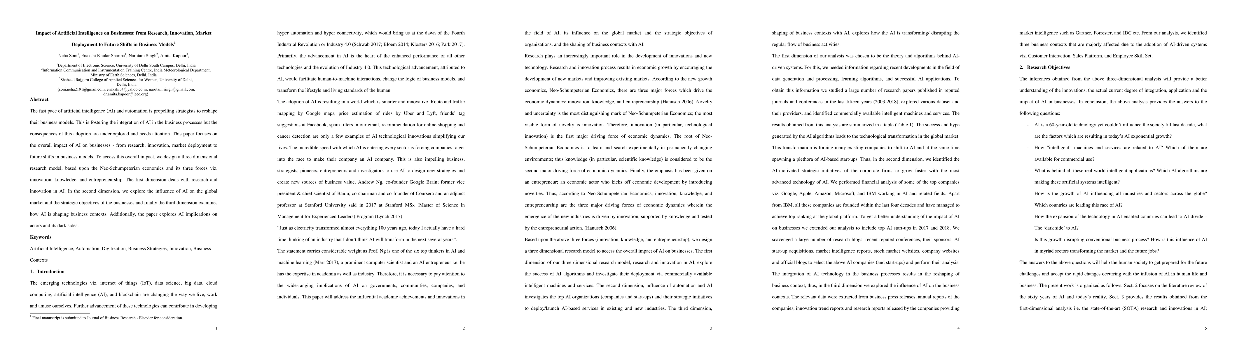 The fast pace of artificial intelligence (AI) and automation is propelling strategists to reshape their business models. This is fostering the integration of AI in the business processes but the consequences of this adoption are underexplored and need attention. This paper focuses on the overall impact of AI on businesses - from research, innovation, market deployment to future shifts in business models. To access this overall impact, we design a three-dimensional research model, based upon the Neo-Schumpeterian economics and its three forces viz. innovation, knowledge, and entrepreneurship. The first dimension deals with research and innovation in AI. In the second dimension, we explore the influence of AI on the global market and the strategic objectives of the businesses and finally, the third dimension examines how AI is shaping business contexts. Additionally, the paper explores AI implications on actors and its dark sides.