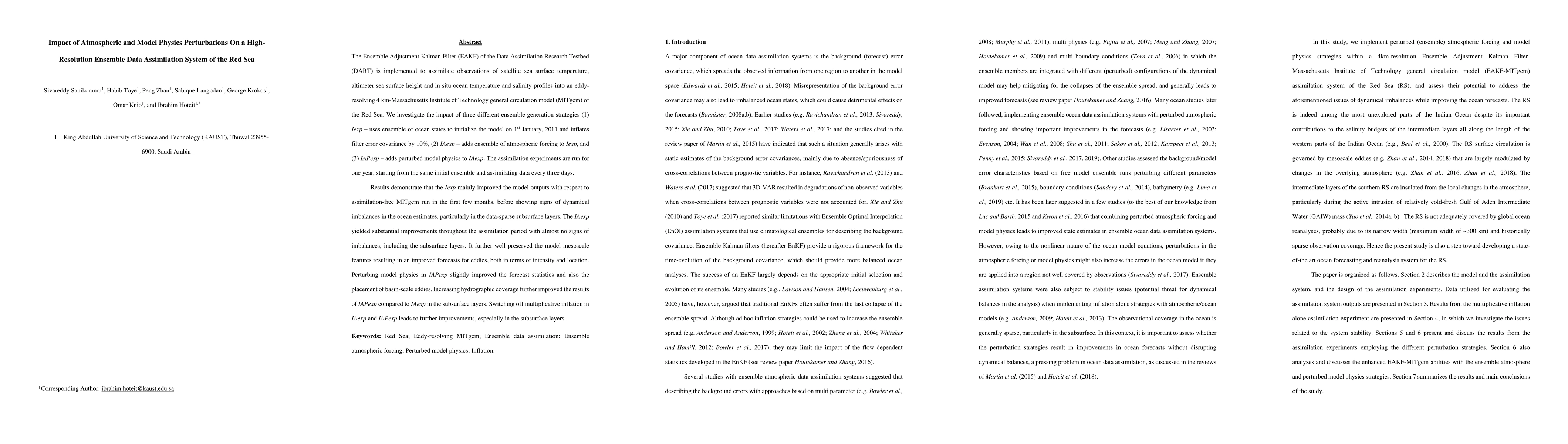 The Ensemble Adjustment Kalman Filter (EAKF) of the Data Assimilation Research Testbed (DART) is implemented to assimilate observations of satellite sea surface temperature, altimeter sea surface height and in situ ocean temperature and salinity profiles into an eddy-resolving 4 km Massachusetts Institute of Technology general circulation model (MITgcm) of the Red Sea. We investigate the impact of three different ensemble generation strategies (1) Iexp, uses ensemble of ocean states to initialize the model on 1st January, 2011 and inflates filter error covariance by 10 percent, (2) IAexp, adds ensemble of atmospheric forcing to Iexp, and (3) IAPexp, adds perturbed model physics to IAexp. The assimilation experiments are run for one year, starting from the same initial ensemble and assimilating data every three days. Results demonstrate that the Iexp mainly improved the model outputs with respect to assimilation free MITgcm run in the first few months, before showing signs of dynamical imbalances in the ocean estimates, particularly in the data-sparse subsurface layers. The IAexp yielded substantial improvements throughout the assimilation period with almost no signs of imbalances, including the subsurface layers. It further well preserved the model mesoscale features resulting in an improved forecasts for eddies, both in terms of intensity and location. Perturbing model physics in IAPexp slightly improved the forecast statistics and also the placement of basin scale eddies. Increasing hydrographic coverage further improved the results of IAPexp compared to IAexp in the subsurface layers. Switching off multiplicative inflation in IAexp and IAPexp leads to further improvements, especially in the subsurface layers.