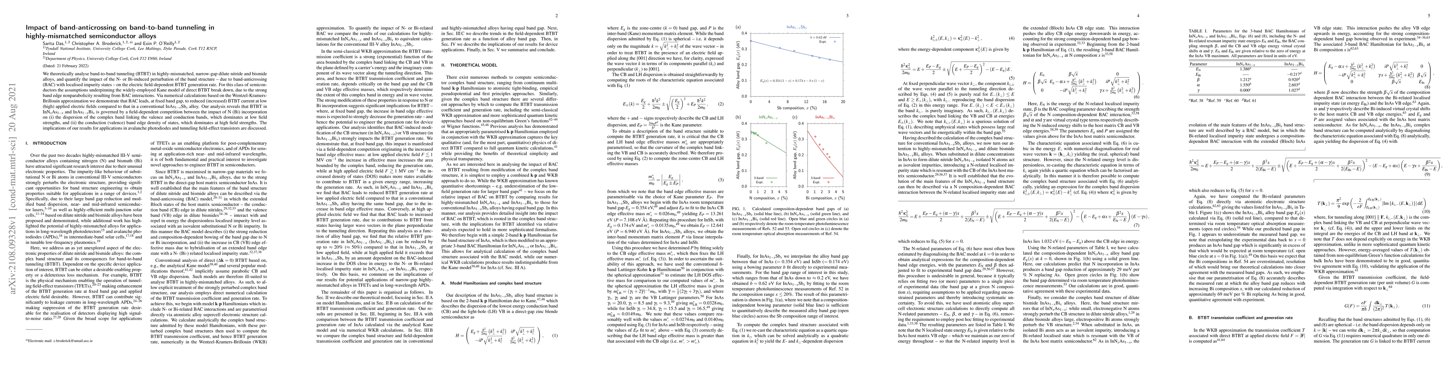 This paper theoretically analyzes the effect of band-anticrossing (BAC) on band-to-band tunneling (BTBT) in highly mismatched narrow-gap semiconductor alloys, showing that BAC alters the BTBT generation rate under varying electric fields. The study reveals a field-dependent competition between BAC's impact on band dispersion and band edge densities, with implications for device applications like photodiodes and field-effect transistors.