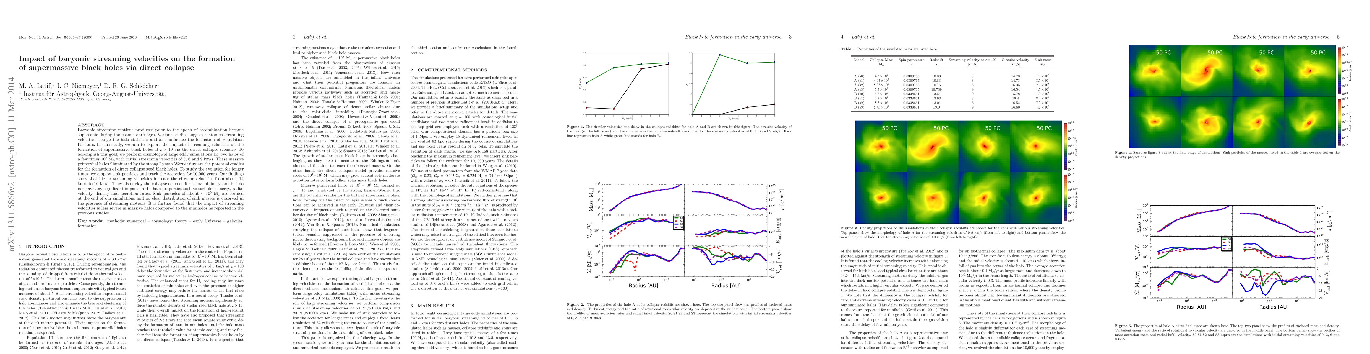 This study investigates how baryonic streaming velocities during the cosmic dark ages affect the formation of supermassive black holes via direct collapse in primordial halos. Results from large eddy simulations show that higher streaming velocities increase circular velocities and delay halo collapse, but do not significantly alter halo properties or the mass distribution of resulting black holes.