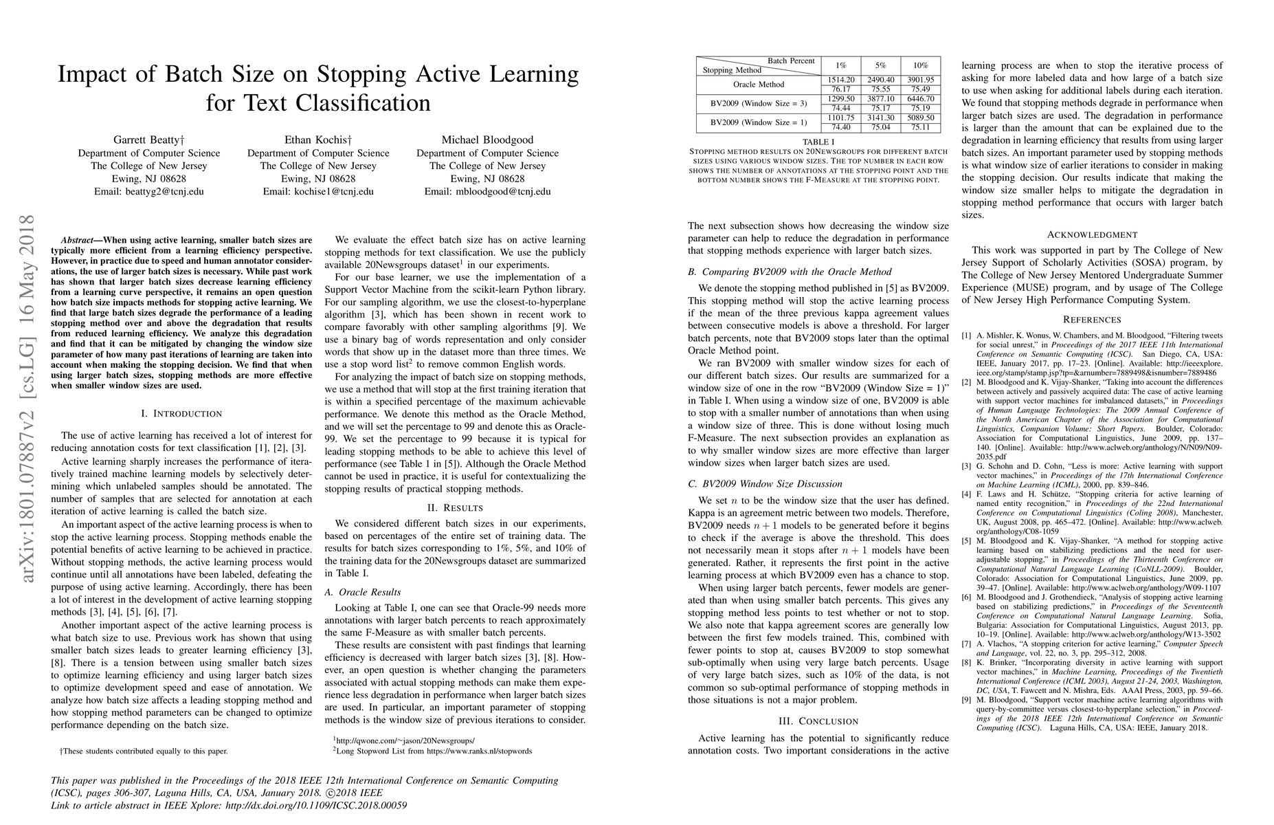 This paper investigates the impact of batch size on stopping active learning for text classification, finding that large batch sizes degrade stopping method performance beyond reduced learning efficiency. The study suggests that smaller window sizes for considering past learning iterations can mitigate this degradation when using larger batch sizes.