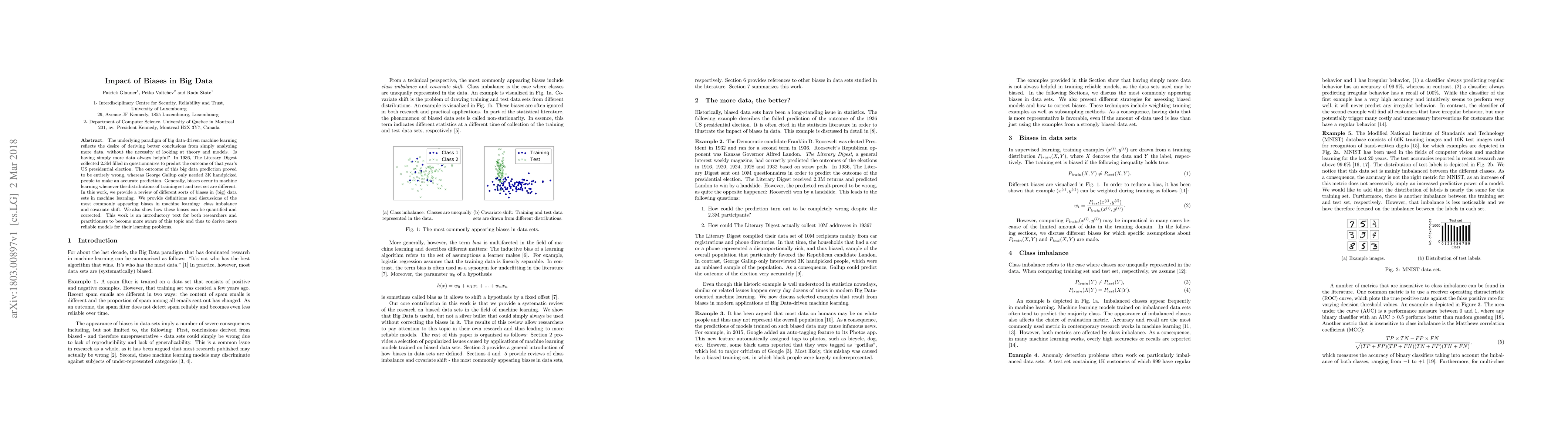 The underlying paradigm of big data-driven machine learning reflects the desire of deriving better conclusions from simply analyzing more data, without the necessity of looking at theory and models. Is having simply more data always helpful? In 1936, The Literary Digest collected 2.3M filled in questionnaires to predict the outcome of that year's US presidential election. The outcome of this big data prediction proved to be entirely wrong, whereas George Gallup only needed 3K handpicked people to make an accurate prediction. Generally, biases occur in machine learning whenever the distributions of training set and test set are different. In this work, we provide a review of different sorts of biases in (big) data sets in machine learning. We provide definitions and discussions of the most commonly appearing biases in machine learning: class imbalance and covariate shift. We also show how these biases can be quantified and corrected. This work is an introductory text for both researchers and practitioners to become more aware of this topic and thus to derive more reliable models for their learning problems.