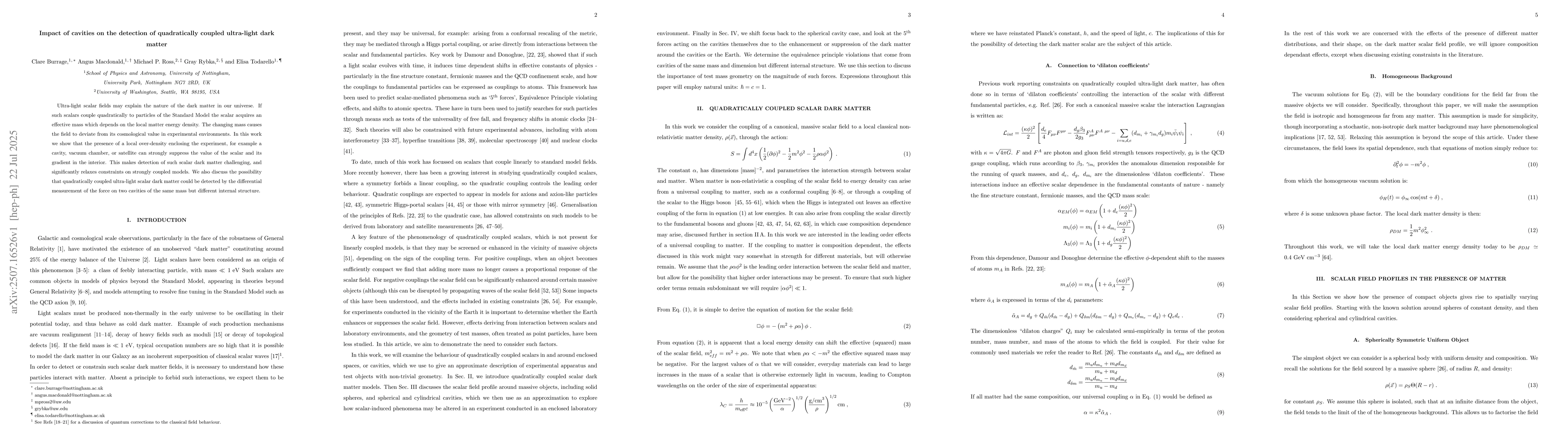 Ultra-light scalar fields may explain the nature of the dark matter in our universe. If such scalars couple quadratically to particles of the Standard Model the scalar acquires an effective mass which depends on the local matter energy density. The changing mass causes the field to deviate from its cosmological value in experimental environments. In this work we show that the presence of a local over-density enclosing the experiment, for example a cavity, vacuum chamber, or satellite can strongly suppress the value of the scalar and its gradient in the interior. This makes detection of such scalar dark matter challenging, and significantly relaxes constraints on strongly coupled models. We also discuss the possibility that quadratically coupled ultra-light scalar dark matter could be detected by the differential measurement of the force on two cavities of the same mass but different internal structure.