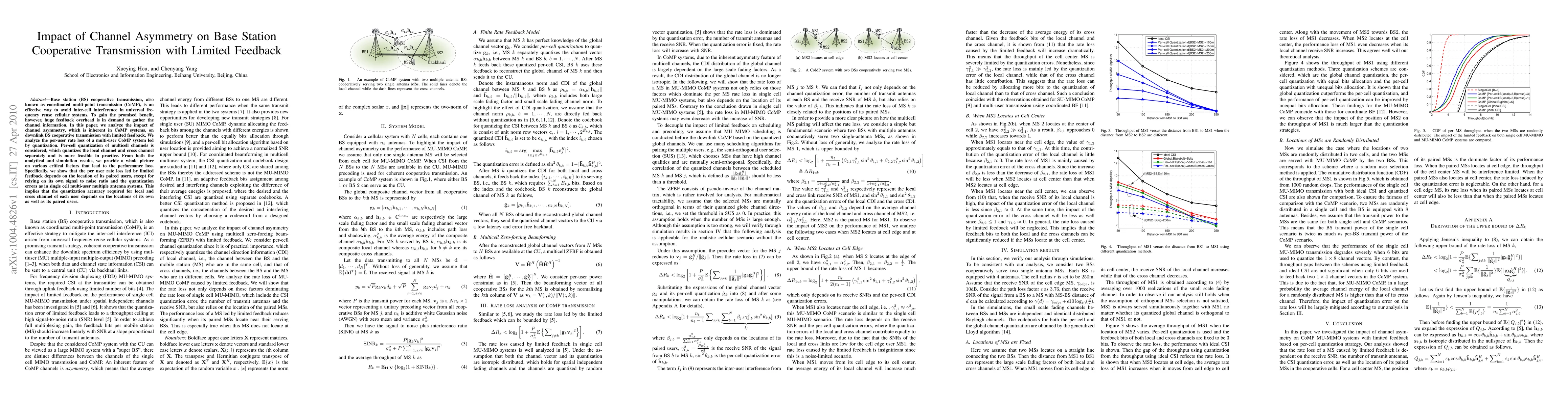 This paper analyzes the impact of channel asymmetry on base station cooperative transmission under limited feedback conditions. It finds that per-user rate loss in multi-user CoMP systems depends on user locations, in addition to signal-to-noise ratio and quantization errors, highlighting the need for location-specific quantization accuracy.
