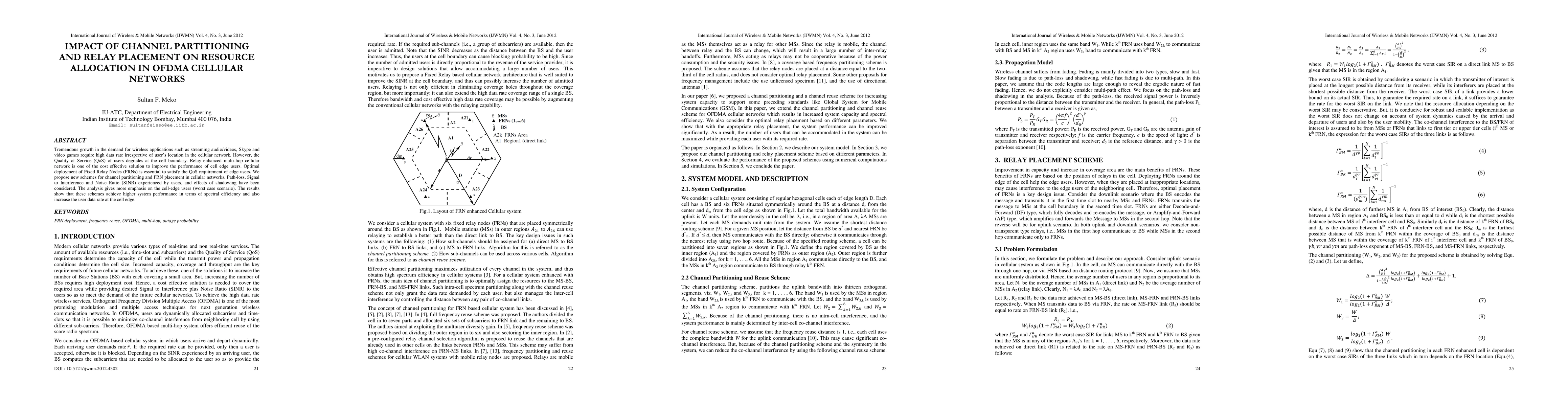This paper proposes new schemes for channel partitioning and fixed relay placement in OFDMA cellular networks to enhance the performance of cell-edge users, focusing on spectral efficiency and user data rate. The analysis considers path-loss, SINR, and shadowing effects, demonstrating improved QoS for edge users.